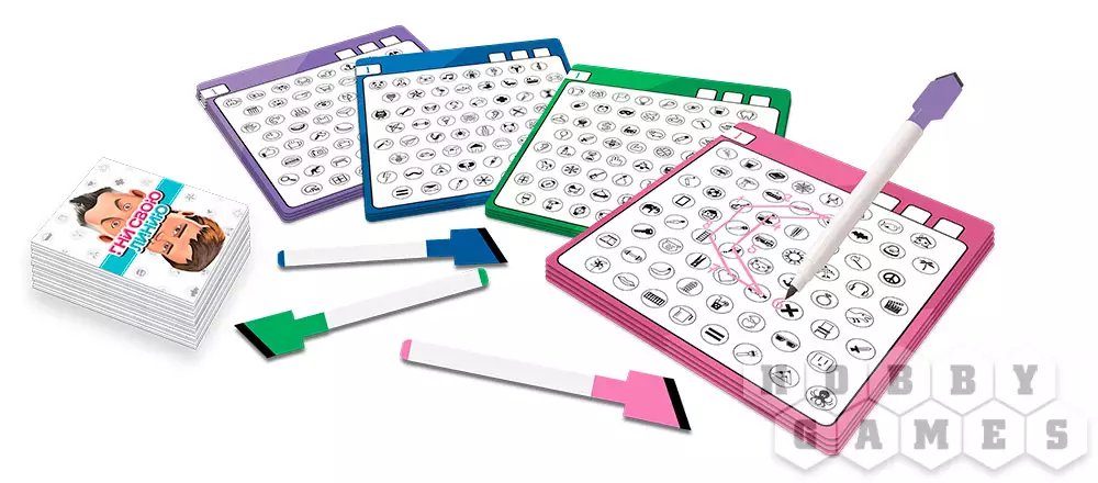 Настольная игра "Гни свою линию" полна веселья и творческого подхода! В ней принимают участие от 2 до 4 команд по 2 человека. Один из членов команды – художник – вытягивает карту и рисует на своём планшете тайное слово, соединяя по порядку разные значки. После этого звуками и жестами он объясняет своему напарнику, какие значки тот должен соединить на своём планшете, чтобы получился такой же рисунок. Та команда, игрок которой первым назовёт загаданное слово, побеждает.