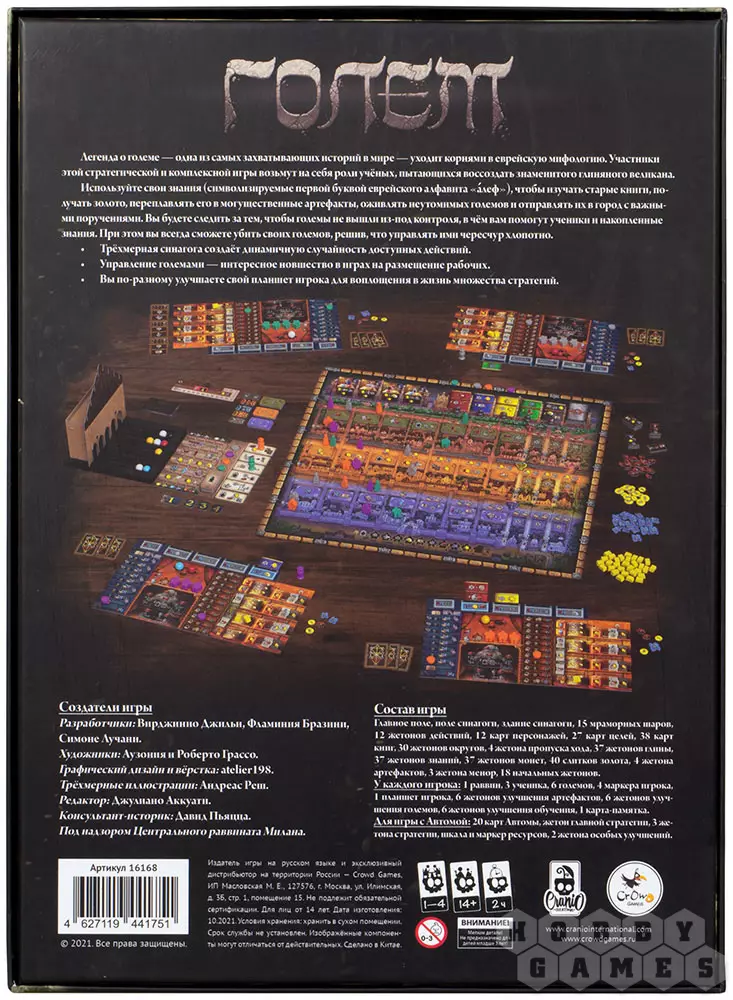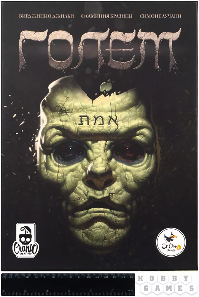 "Голем" – это комплексная настольная игра с немалым количеством различных механик. Вы отправитесь в Прагу XVI века, чтобы стать величайшим учёным своего времени. В вашем распоряжении стопки древних писаний и верные ученики, внимающие каждому слову. Выполняйте различные цепочки действий и получайте бонусы. Каждый шаг приносит победные очки, а чем шаги продуманнее, тем больше очков вы получите и станете более успешным учёным. Накопите необходимые знания и приобретите нужные артефакты, чтобы воссоздать труды раввина Лёва и сотворить собственного голема!
