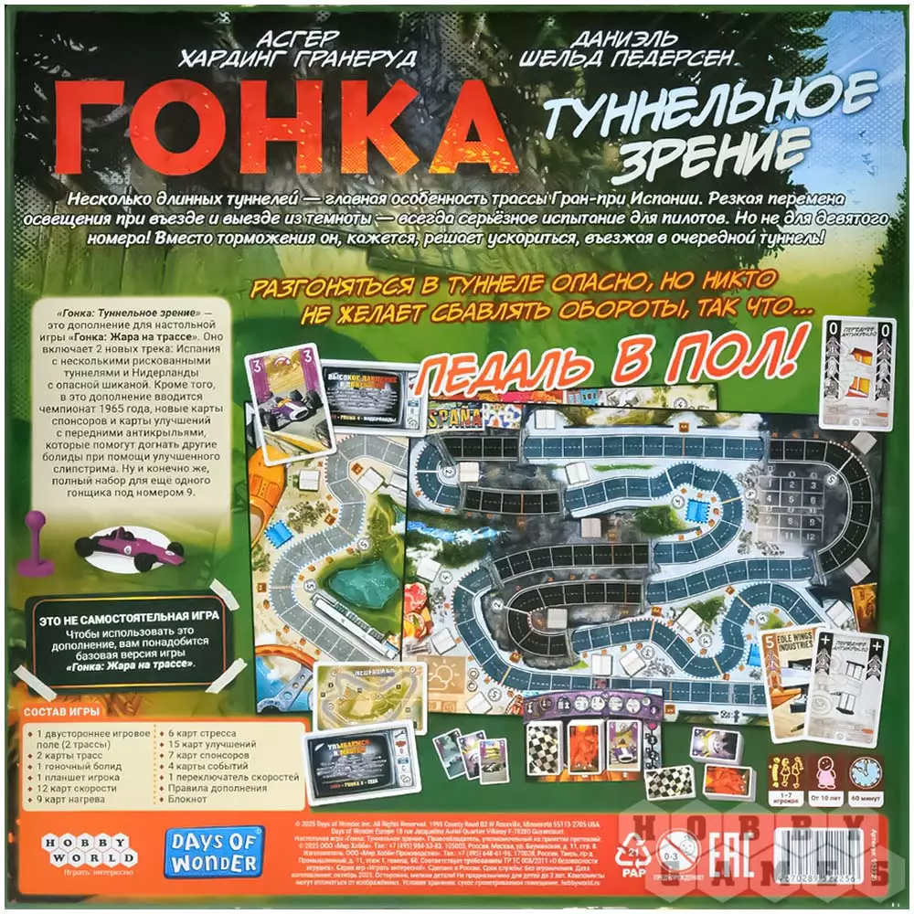 "Гонка: Туннельное зрение" – второе дополнение к игре "Гонка: Жара на трассе", добавляющее две новые трассы, вдохновлённые Гран-при Испании и Нидерландов. Оно вводит свежие механики – туннели и обновлённые условия прохождения поворотов. Появляются карты улучшения переднего крыла, события сезона и возможность играть вплоть до 7 участников (или 8 с дополнением "Ливень"). Дополнение идеально подходит тем, кто хочет повысить сложность и добавить в заезды больше напряжения и стратегической глубины!