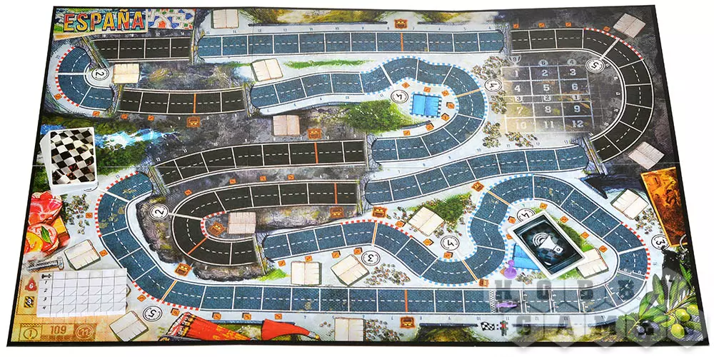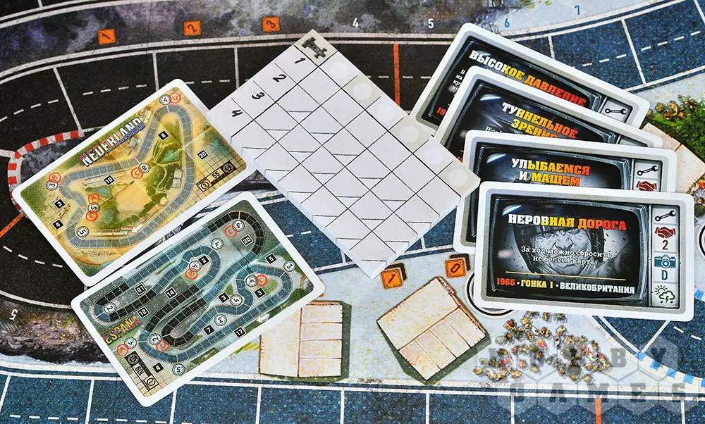 Выберите свой цвет и возьмите все компоненты этого цвета: болид, планшет игрока, переключатель скоростей, 12 карт скорости и 3 карты начальных улучшений. Дополнительно возьмите карты стресса и нагрева (их количество указано на карте трассы). Перемешайте полученные карты (кроме нагрева) и выложите составленную колоду в левую ячейку своего планшета, а карты нагрева в среднюю – это ячейка двигателя. Расположите болиды на игровом поле и возьмите из своей колоды 7 карт. Всё готово к гонке!