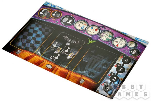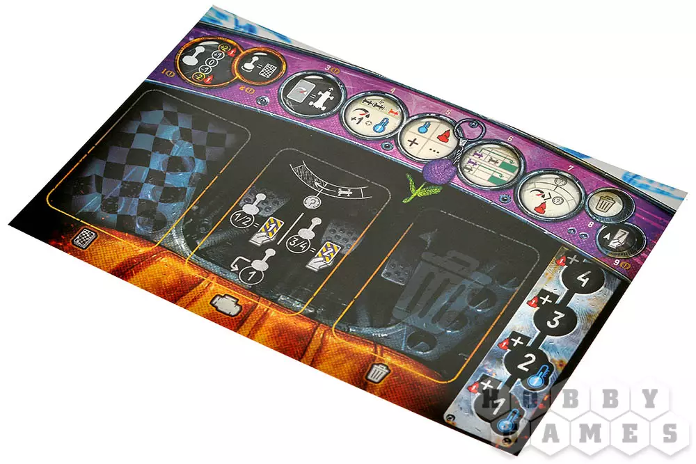 Этап 5. Реакция. На этом этапе вы применяете все доступные вам символы с разыгранных карт в любом порядке. Можете ускориться и переместиться на ещё одну клетку, но для этого придётся сбросить карту нагрева с ячейки двигателя. А ещё можно охладить двигатель! Для этого переложите карты нагрева с руки в соответствующую ячейку на своём планшете.