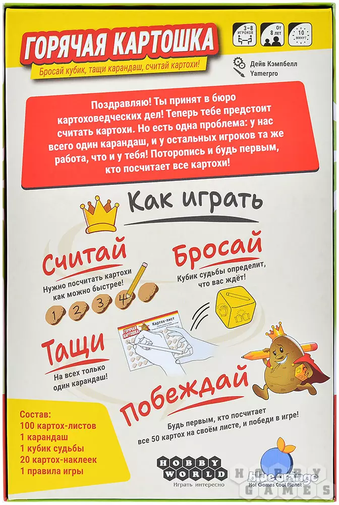 "Горячая картошка" – это детская настольная игра, играть в которую будет весело всей семье или же компании друзей! Вам придется проявить не только ловкость, но и скорость, чтобы опередить соперников!