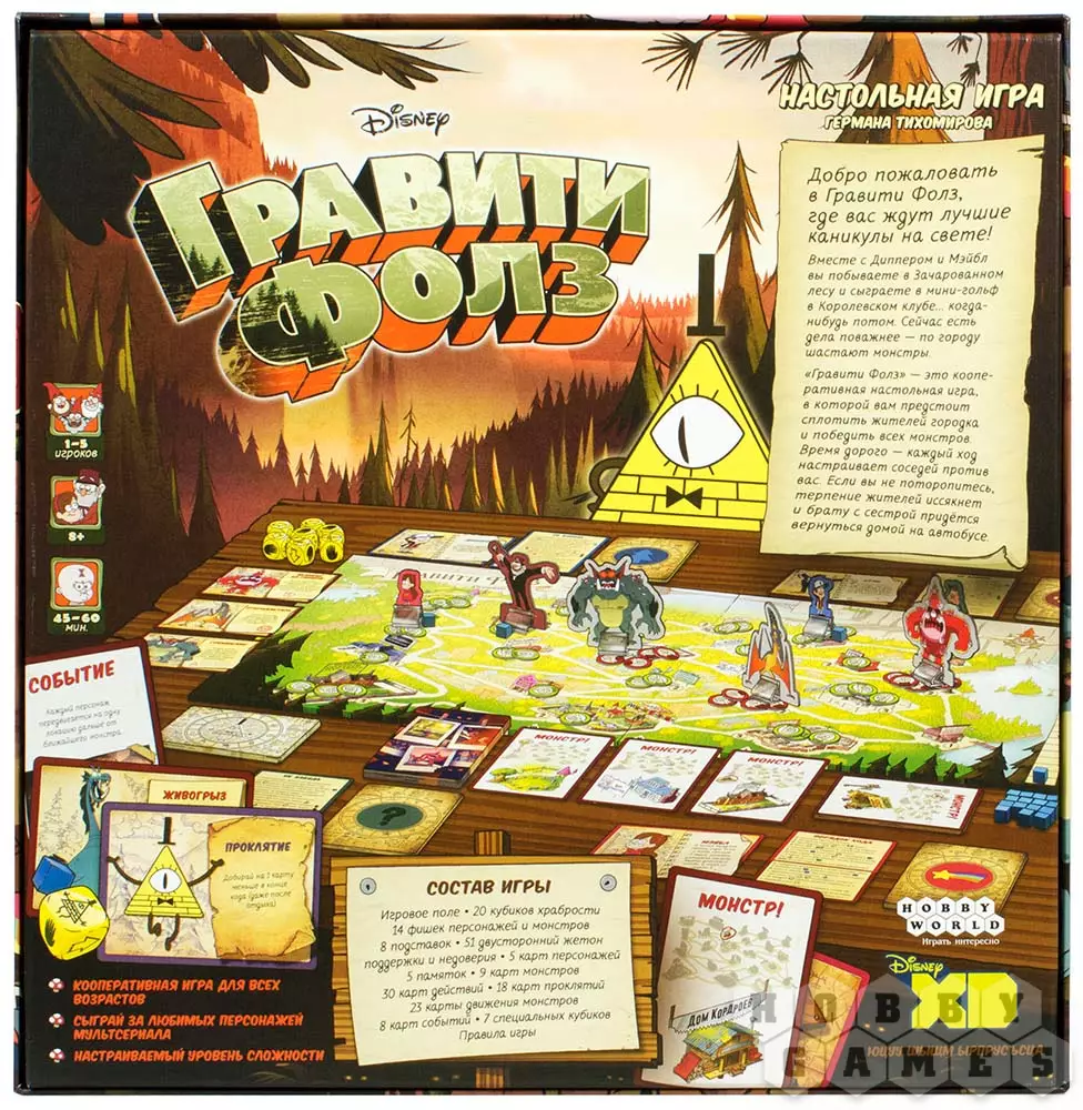 "Гравити Фолз" – это волшебная настольная игра по мотивам диснеевского мультфильма, покорившего миллионы и детских и взрослых сердечек по всему миру! Мультфильм поражает своей рисовкой, увлекает интересным сюжетом, добротой и яркими персонажами. Многим фанатам очень хотелось продолжения истории… И теперь у вас появилась возможность лично отправиться в чудный городок.