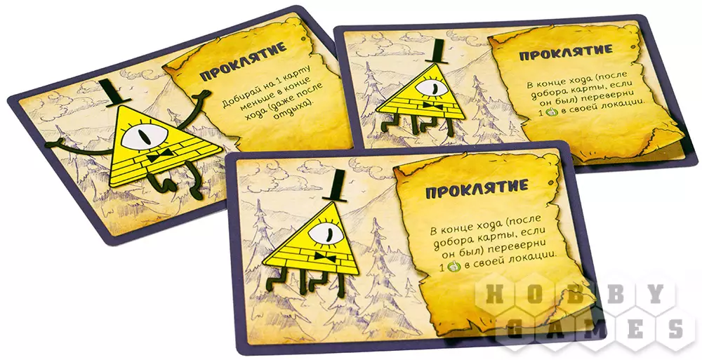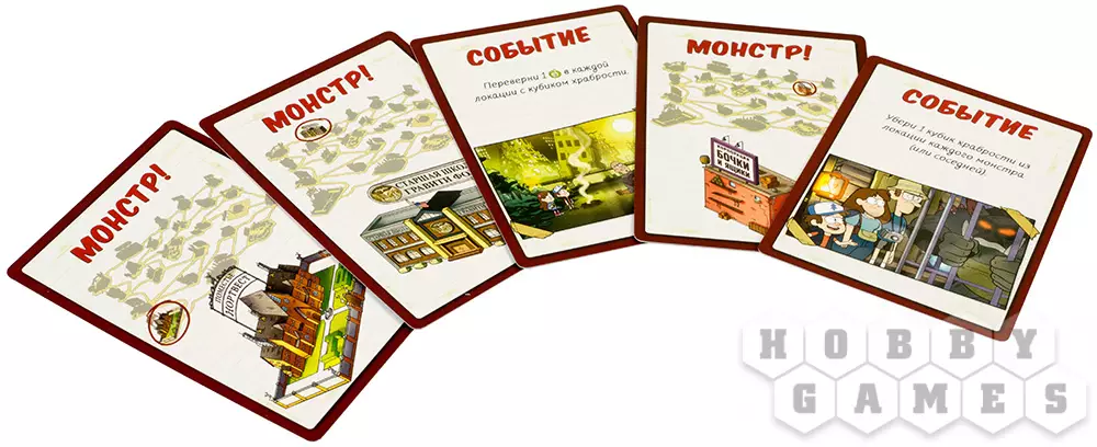 В этой кооперативной игре для 1 – 5 игроков вам предстоит путешествовать по Гравити Фолз, защищать его от монстров и убеждать горожан помочь вам. С каждым ходом от монстров всё больше бед, и доверие к игрокам падает. Чтобы не допустить этого, вам нужно победить их до того, как маркер тревоги достигнет предельного значения.
