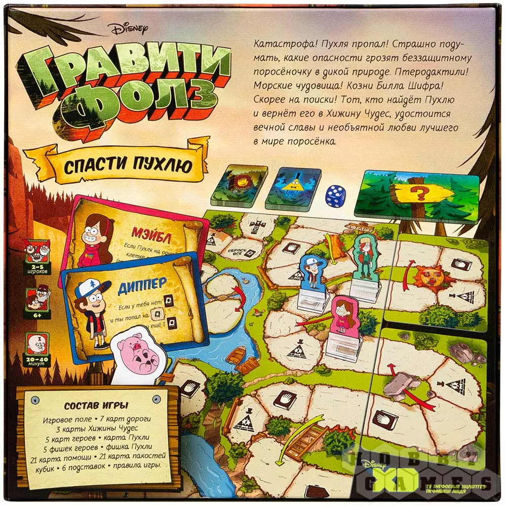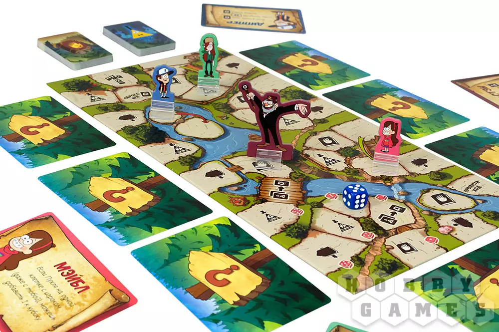 Matuhash12.10.2020 15:28Забавная детская игра. Кинь-двинь, но с картами помощи и пакостей. Интересно решение с картами дороги, которые являются продолжением игрового поля. В правом нижнем углу коробки с обратной стороны есть надпись, на первый взгляд набор букв, но если их набирать на клавиатуре на английской раскладке, то выйдет надпись "не пытайтесь покинуть Гравити Фолз"