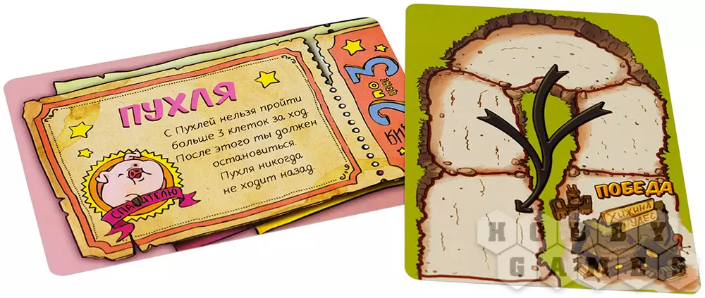 15.06.2022 14:28Здравствуйте! 1) Карточка Хижины открывается когда попал на клетку с Тотемом, а не со Стрелкой. А клетка с Тотемом действует также, как клетка с Указателем, это значит, что ты должен остановить свою фишку на клетке с указателем (даже если кубик позволяет идти дальше) (всё это есть на страницах 4 и 5 правил игры). 2) Когда вы возвращаетесь назад, то не берёте с собой Пухлю. Фишка Пухли никогда не двигается назад, она остаётся на самой дальней клетке, куда её донесли. Соответственно, на этой карте Хижины, где нужно сделать больше трёх шагов, когда вы впервые прошли с Пухлей на три клетки, то вы вернулись, а Пухля осталась впереди. Следующий, кто пойдет вперед подхватит Пухлю и донесёт до финиша. (стр. 5 в самом конце "Простой принцип"). 3) Никто не может уйти вперед без Пухли, она всегда у того, кто впереди (стр. 5 в самом конце "Простой принцип").