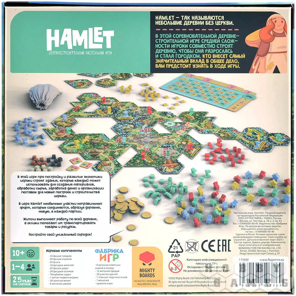 Интересный факт: словом Hamlet в британском английском языке называют небольшую деревушку без церкви. Отсюда и пошло название этой соревновательной настольной игры, в которой вам вместе с остальными игроками предстоит развивать деревню, присоединяя к ней новый участки земли и строя на них различные производственные здания.