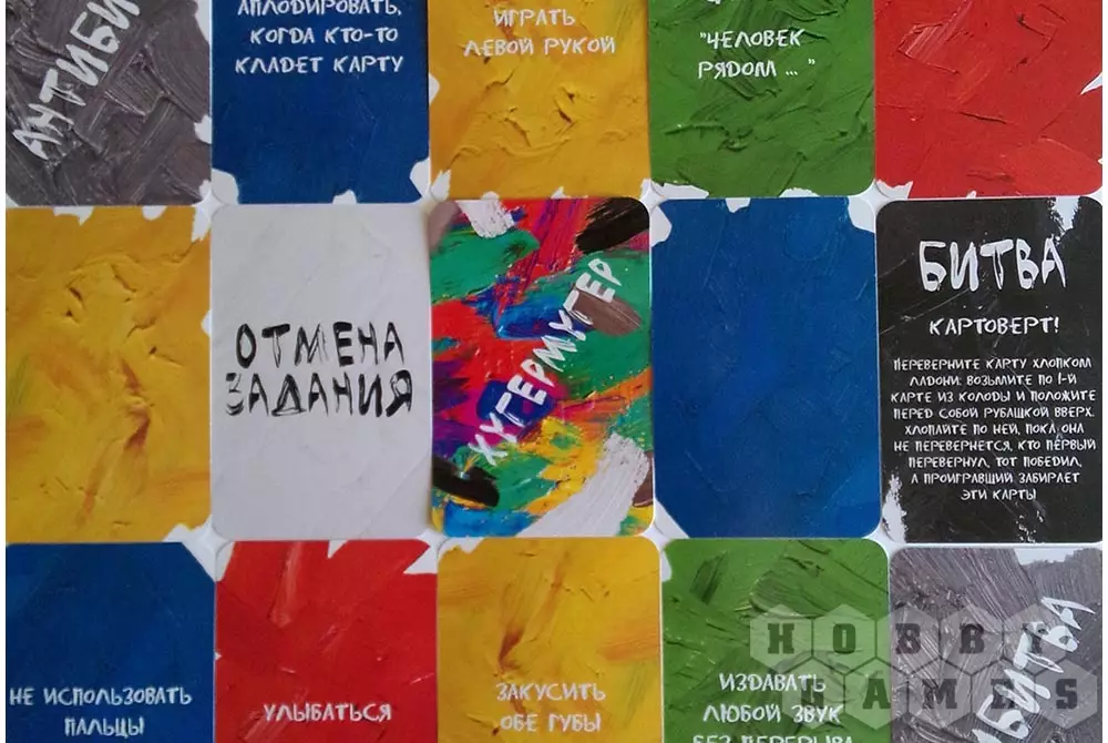 Также в колоде присутствуют белые карты, позволяющие отменить задание, чёрные карты "Битва", запускающие дуэль между двумя игроками, а также серые карты "Антибитва", с помощью которой можно перевести "Битву" на другого игрока.