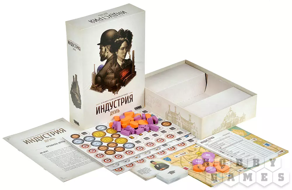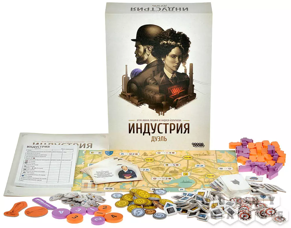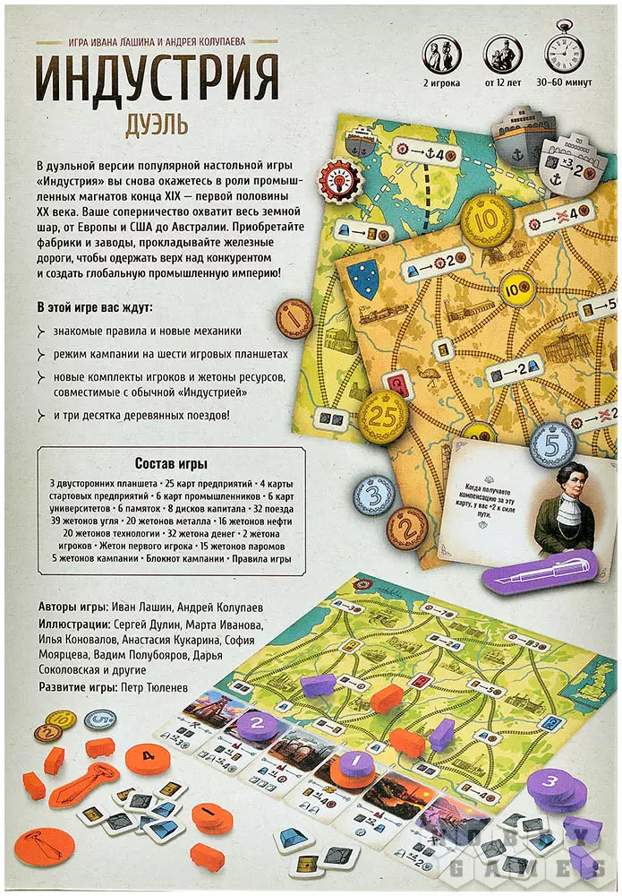 В дуэльной версии настольной игры "Индустрия", как и в оригинале, вы вновь возьмёте на себя роли промышленников. Но на этот раз вам предстоит не только приобретать заводы и производить ресурсы, но и прокладывать железные дороги по всему земному шару – от Европы и США до Австралии! В наборе вас ждёт целых 6 игровых полей со своими особенностями и дополнительными правилами: на партию можно выбрать любой из них, а можно сыграть целую кампанию из шести последовательных раундов.