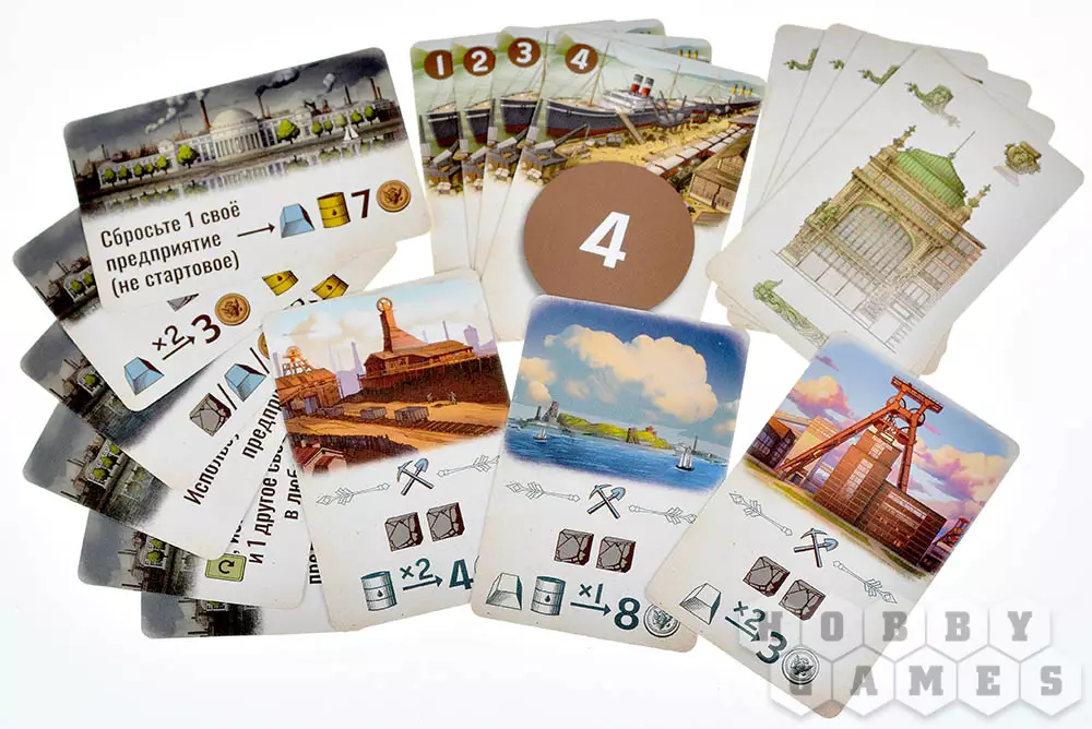 В начале партии у каждого игрока есть по одной карте промышленника и предприятия: с пустыми руками не пробиться на вершину успеха, а имея даже самый захудалый сталелитейный завод можно добиться многого! Главное грамотно распорядиться имеющимися ресурсами.