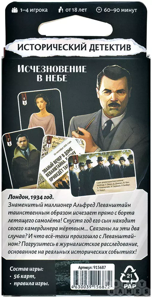 В игре "Исторический детектив: Исчезновение в небе" игроки берут на себя роли сыщиков, которым было поручено расследовать это нелёгкое дело. Для проведения партии понадобится мобильный телефон с функцией чтения QR-кодов – это необходимо, чтобы в финале определить, насколько ваши догадки близки к истине.