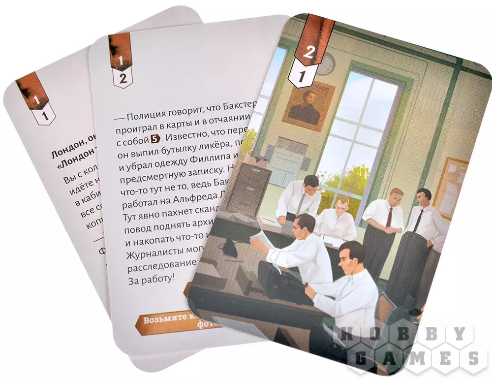 С обратной стороны может содержаться как просто информация, так и нечто большее – например, карта может предписать вам открыть новую колоду, что расширит спектр действий сыщиков. Особое внимание следует обратить на иллюстрации – на них также могут находиться улики! Мимика и эмоции допрашиваемого, небольшие детали окружения – даже на первый взгляд незначительный элемент может привести к разгадке.