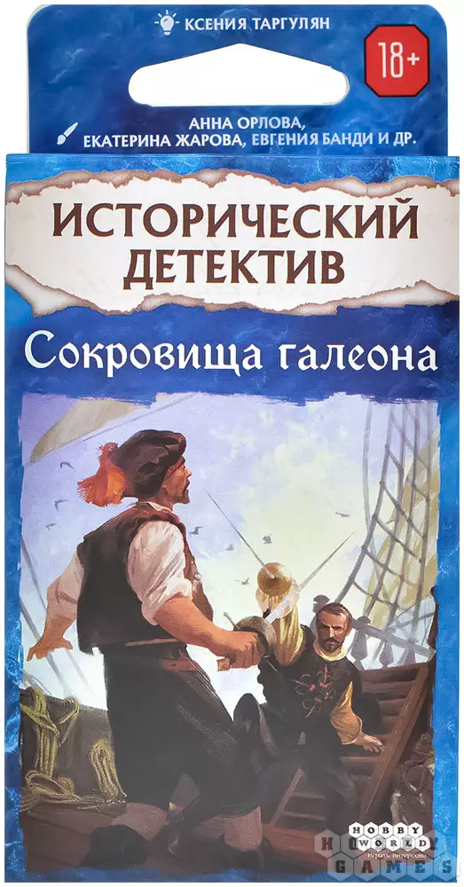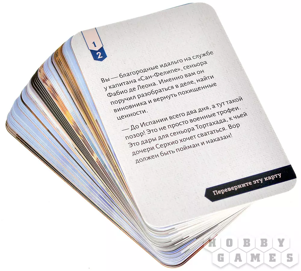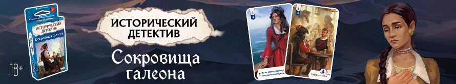 "Сокровища галеона" – настольный детектив с атмосферой исторического приключения, где вы расследуете кражу на борту испанского галеона. Игра рассчитана на компанию от одного до четырёх игроков. В вашем распоряжении тринадцать колод карт, каждая из которых раскрывает новые улики, диалоги с персонажами и детали обстановки. Уникальность игры – в её визуальной составляющей: иллюстрации полны скрытых подсказок, а эмоции персонажей помогают понять, кто лжёт. Механика действий добавляет напряжённости – каждое решение должно быть взвешенным. Вы будете разгадывать тайну, переворачивая карты, но будьте внимательны: некоторые из них требуют затраты действий, а другие открываются бесплатно. В конце игры вас ждёт финальный тест – сканирование QR-кода с вопросами, где вы проверите свою интуицию и логику.