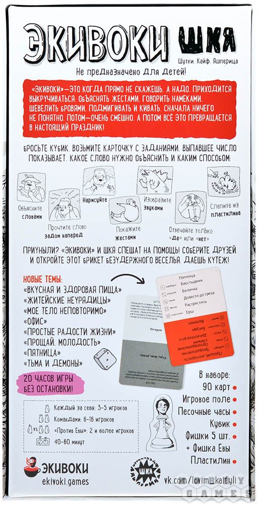 "Экивоки: ШКЯ" – это всё те же любимые многими "Экивоки", но приправленные популярными интернет-комиксами ШКЯ от Евы Морозовой. В коробке вас ждут новые, но настолько жизненные темы, что будто и не новые вовсе: "Пятница", "Житейские неурядицы", "Прощай, молодость". В общем, буквально каждая карточка заставить вас говорить "жиза". Шутки, кайф, и, конечно, яшперица вам обеспечены!