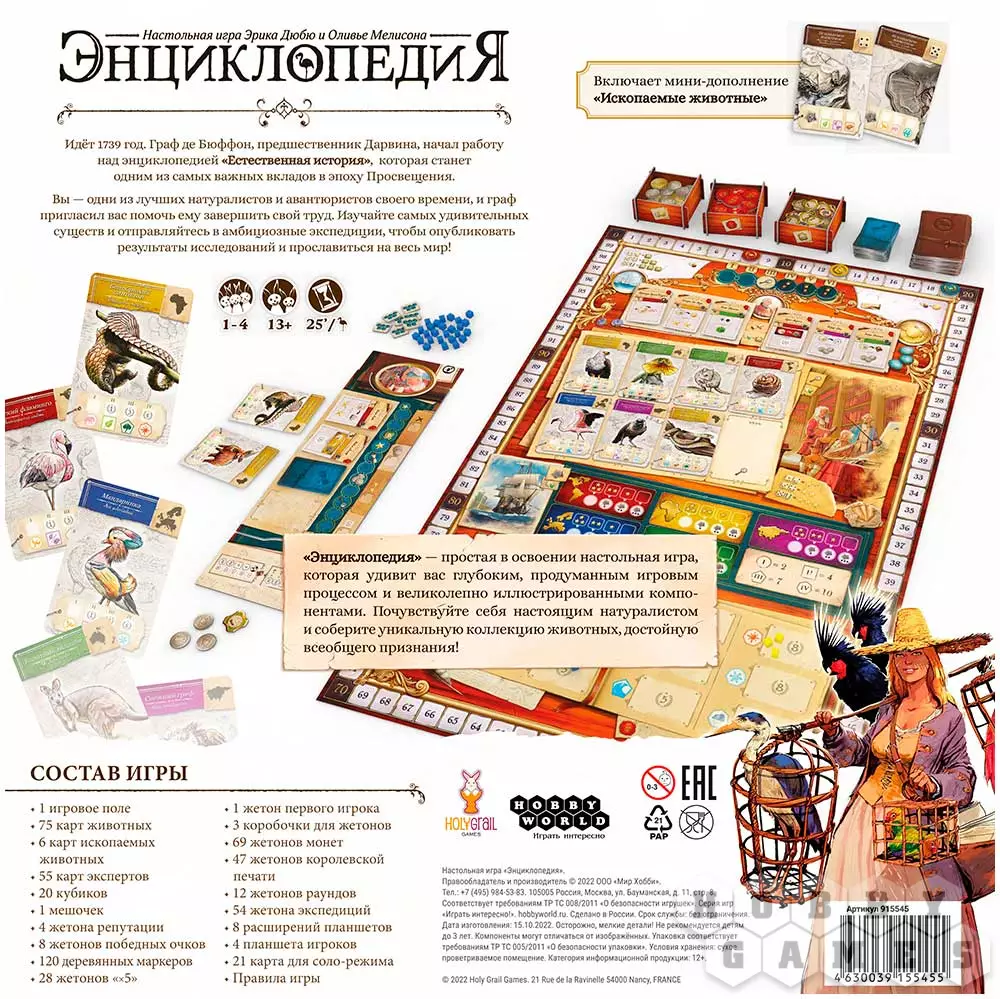 "Энциклопедия" – простая в освоении настольная игра, которая удивит вас глубоким, продуманным игровым процессом и великолепно иллюстрированными компонентами. Почувствуйте себя настоящим натуралистом и соберите уникальную коллекцию животных, достойную всеобщего признания!
