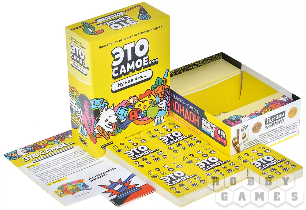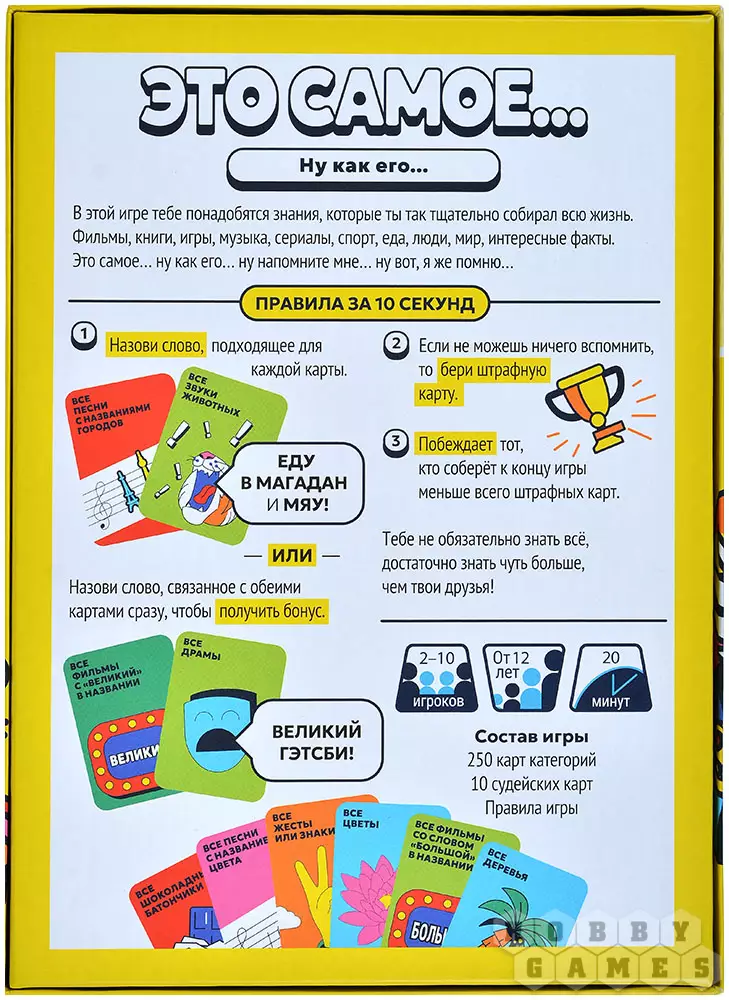 "Это самое..." – карточная игра, в которой вы будете тянуть карты категорий. Для каждой из них нужно будет подобрать подходящее слово. А если вы сможете придумать одно слово, уместное для обеих карт, то получите бонус! Не справились? Штраф! А точнее, штрафная карточка. Берегитесь: наберёте слишком много – и проиграете. Ведь победит тот, у кого их будет меньше всего...