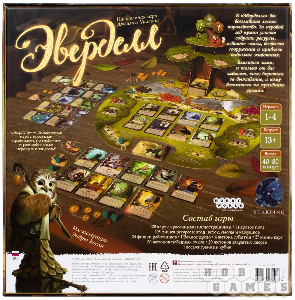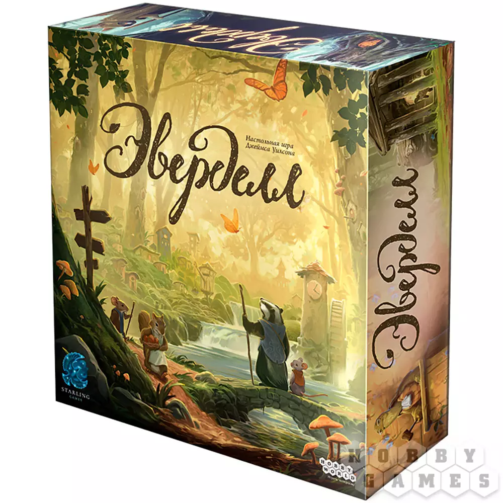 "Эверделл" – это волшебная настольная игра для 1-4 игроков и само воплощение тепла и уюта. Действие игры происходит в сказочном мире, где животные разговаривают и дружно живут вместе в лесных городах. Прежде всего, игра удивит Вас своим очаровательным дизайном игрового поля и компонентов, в которых используются мягкие и приятные цвета. Во главе игрового поля стоит настоящее дерево, которое нужно будет собрать по инструкции из картонных элементов. Дерево не просто выполняет декоративную функцию – на его ветвях располагаются карты и фигурки.