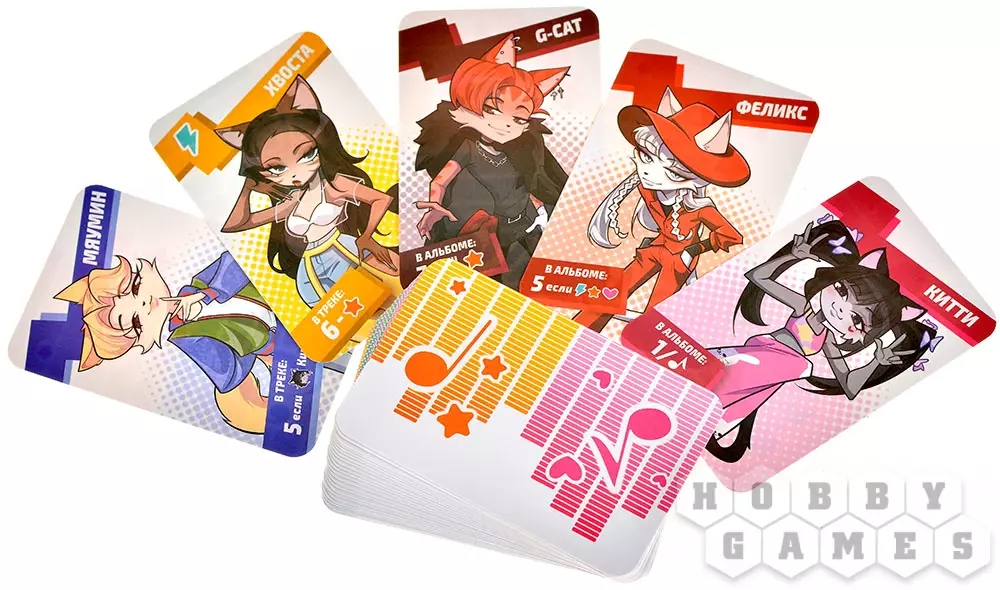 В свой ход вы берёте пару карт с игрового поля: карту исполнителя и соответствующую ей нотную партию. Карты музыки выкладываете в треки, которые всегда начинаются со скрипичного ключа, а затем размещаете исполнителей поверх нот, соблюдая их требования – некоторые котики работают только с определёнными типами нот. Каждый исполнитель приносит очки по-своему: одни дают бонусы за собратьев по группе, другие – за комбинации нот, третьи устраивают мини-соревнования между игроками. Собирайте завершённые треки, используйте уникальные способности котиков и следите за действиями соперников – победа достанется самому креативному продюсеру.
