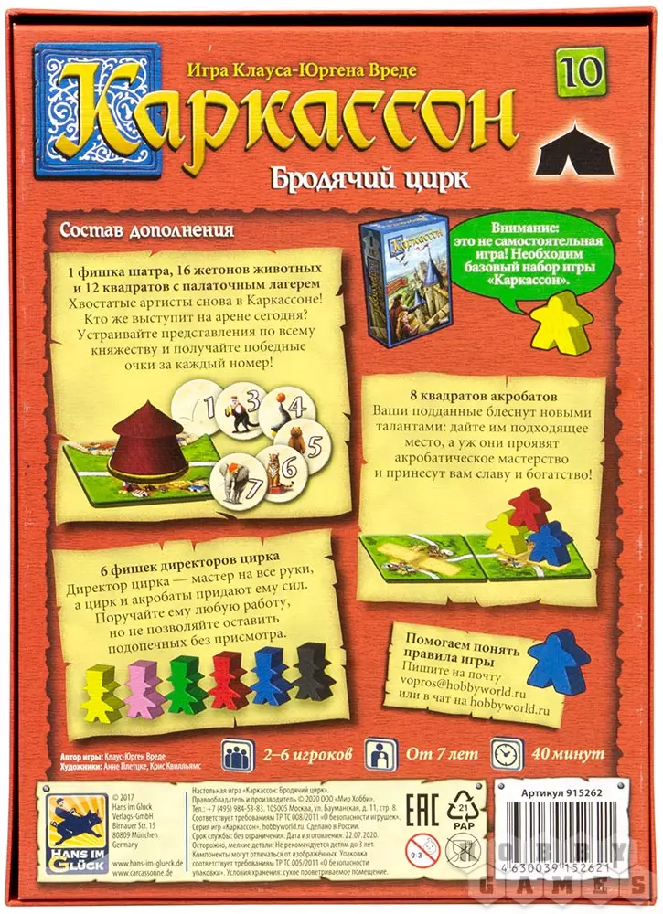 "Каркассон: Бродячий цирк" – десятое дополнение для легендарной настольной игры. Вас ожидают все необходимые компоненты для организации запоминающихся и любимых публикой цирковых представлений. Поставьте палаточный лагерь и выпускайте на арену дрессированных животных. Нанимайте мастеровитых и талантливых акробатов, способных творить невероятные чудеса в воздухе. Заручитесь поддержкой парочки толковых директоров, которые смогут эффективно руководить труппой. Это предприятие обязательно принесёт вам славу и богатство, а каждый запоминающийся цирковой номер в конце игры будет приравниваться к дополнительным победным очкам!