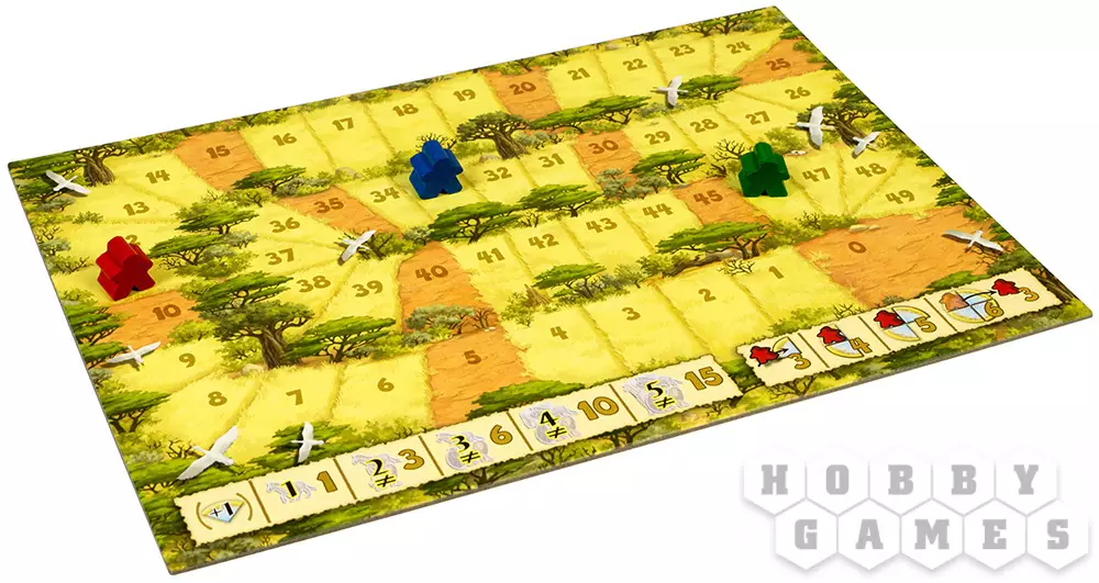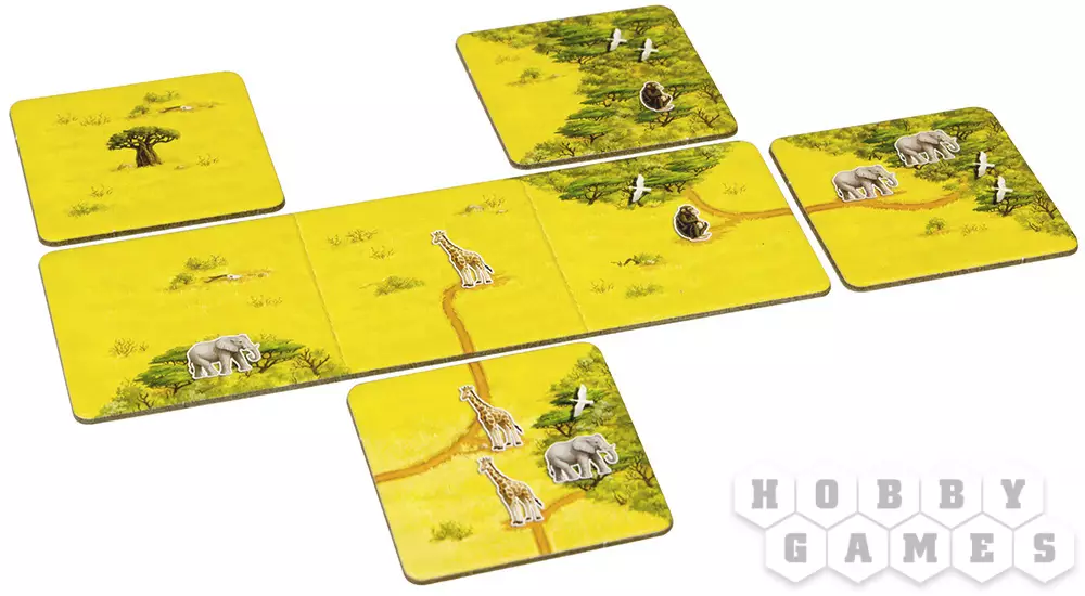 По ходу игры, как и в классическом “Каркассоне”, игроки по очереди выкладывают тайлы, ход за ходом составляя карту местности, включающую в себя различные объекты: тропы, заросли, саванну и баобабы. На каждый элемент можно отправить своего рабочего, заняв таким образом объект. Чем больше на этом объекте различных видов животных, тем больше очков сможете получить. Важно помнить, что рабочих всего лишь шесть, так что борьба за самые лакомые уголки неизбежна. Чтобы забрать работника и получить очки, ваш объект должен быть “завершён”: например, тропа должна иметь начало и конец, а заросли должны стать замкнутым пространством.