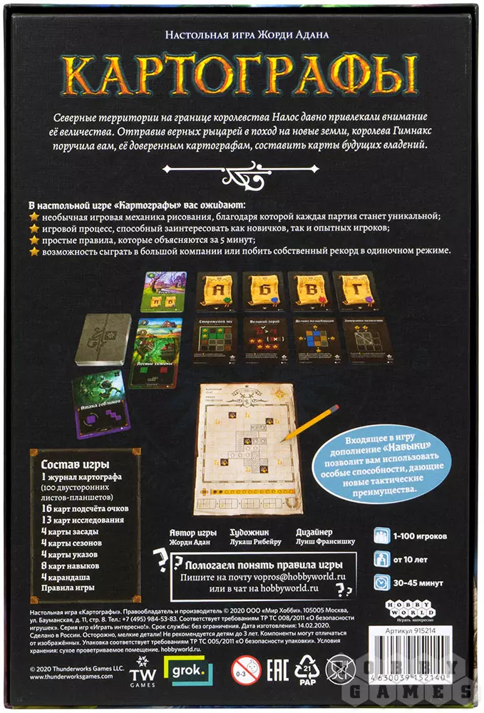 Юрий Борщев28.01.2021 22:49Открыл для себя этот замечательный магазин с игры "Картографы". Покупка была спонтанная за полчаса до закрытия магазина, где встретил дружелюбный консультант, отдав заказ пожелал хорошего вечера. Действительно, вечер выдался отличным. Игра завораживает своими иллюстрациями, подкупает то, что она реиграбельна, масса вариаций развития событий. Отдельно понравится тем, в ком есть задатки творческой личности :) Рекомендую! -