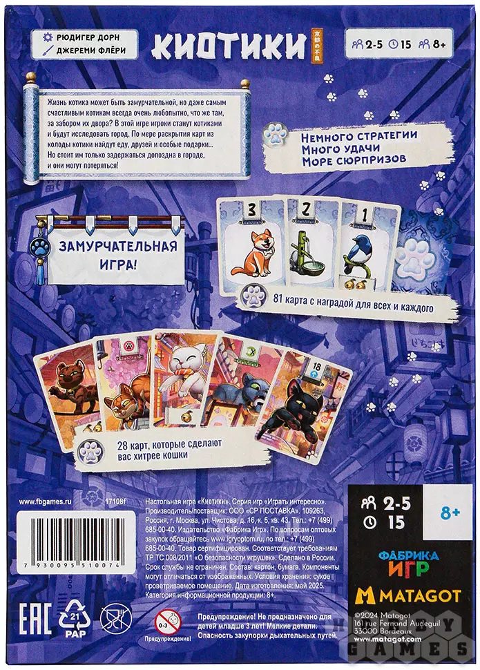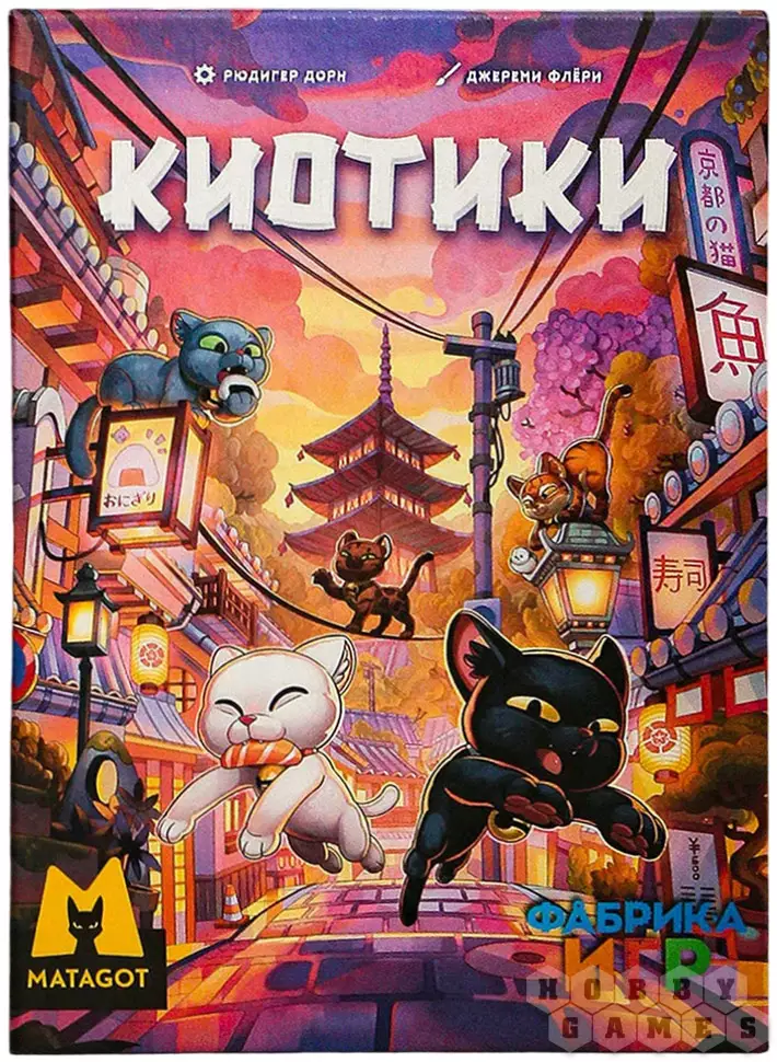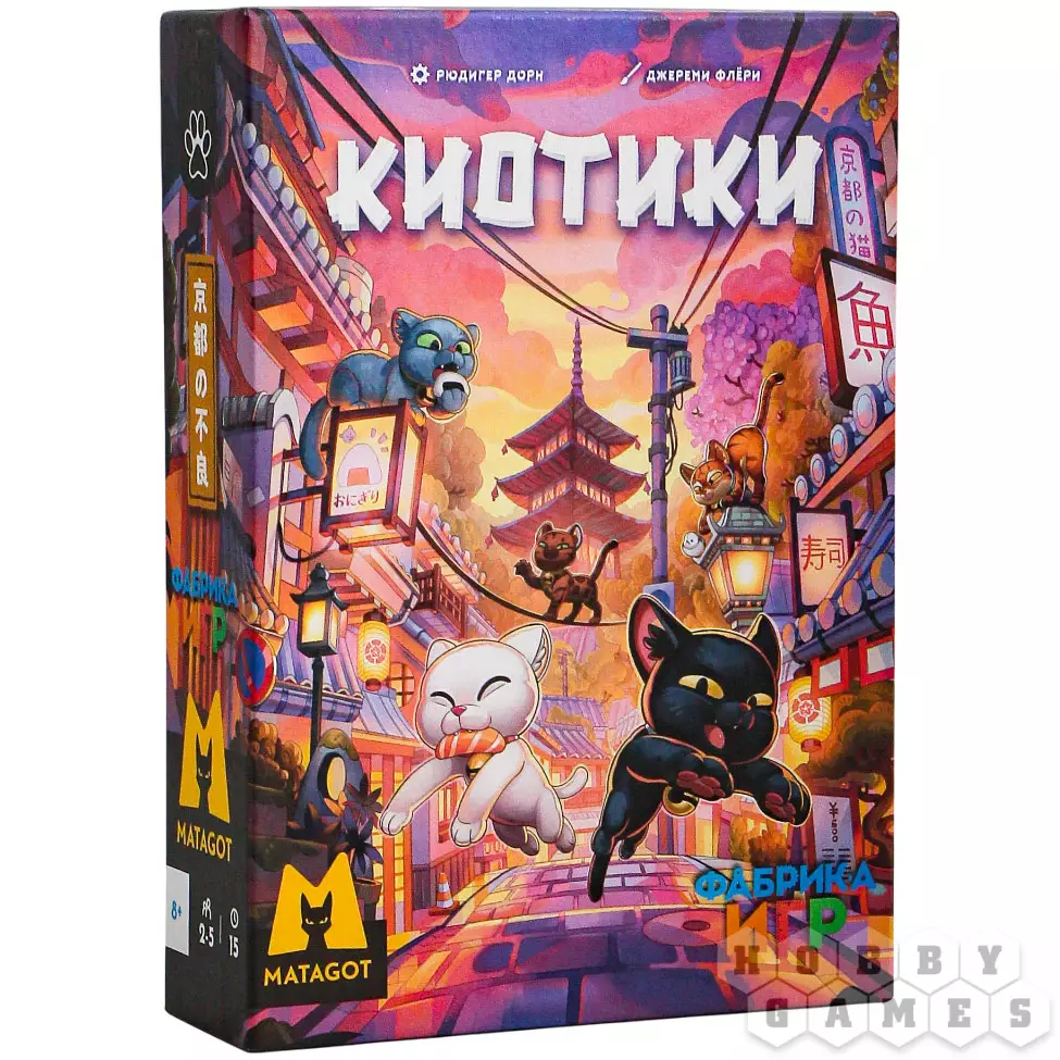 "Киотики" – компактная карточная игра, где вы управляете котиками, жаждущими приключений. Основная механика построена на неожиданном повороте: вы не просто берёте карты, а выбираете, кому они достанутся – себе или соперникам. Каждая карта добавляет часы времени, и если их сумма достигает тринадцати, игрок "задерживается дотемна" и теряет все карты раунда! Но не всё так страшно: на многих картах есть символы, дающие полезные эффекты – от дополнительных ходов до защиты от провала. Уникальность игры в её динамике и тактике: нужно балансировать между риском и наградой, подкидывая "опасные" карты оппонентам. "Киотики" радуют милыми иллюстрациями, а партия длится всего пятнадцать минут – идеально для весёлых посиделок или путешествий!