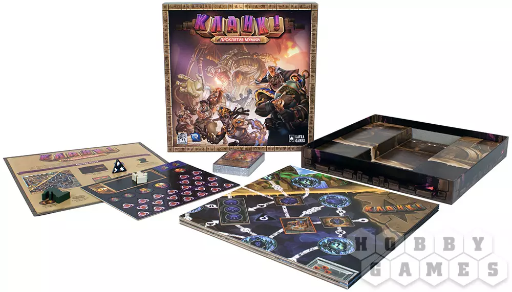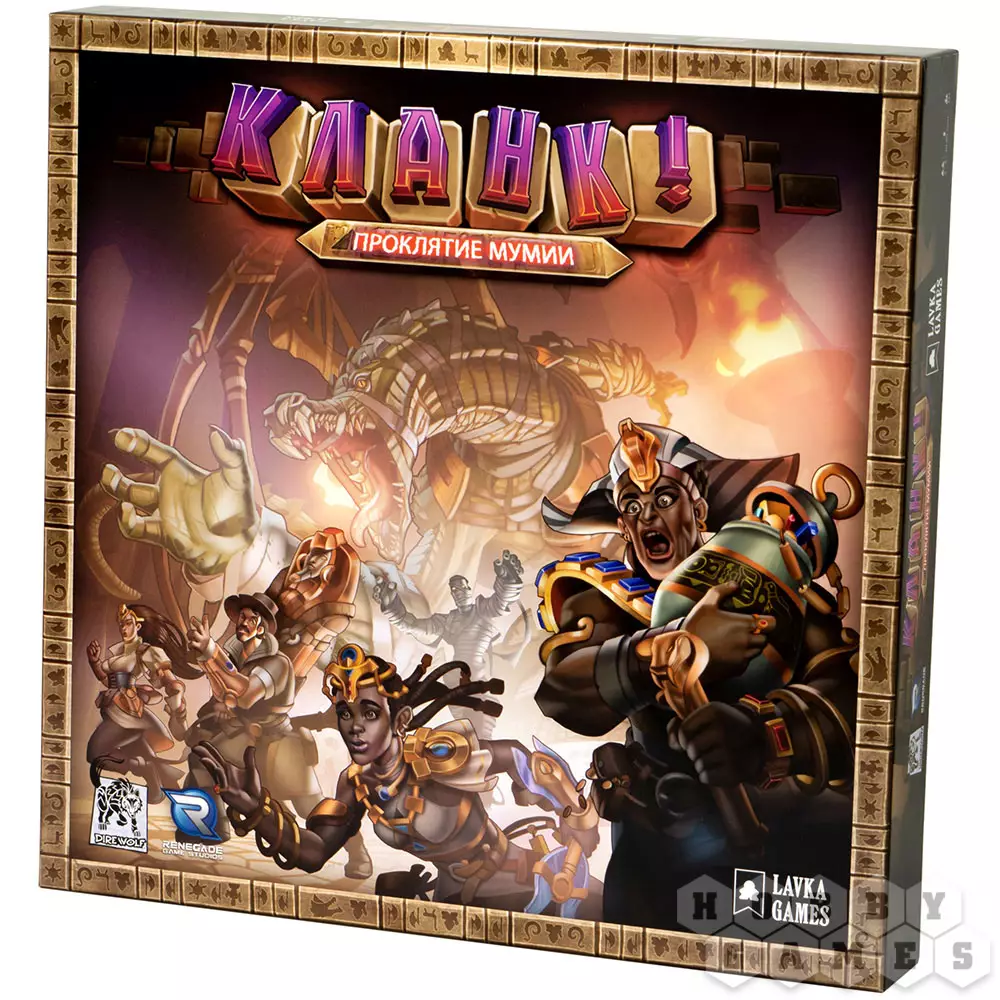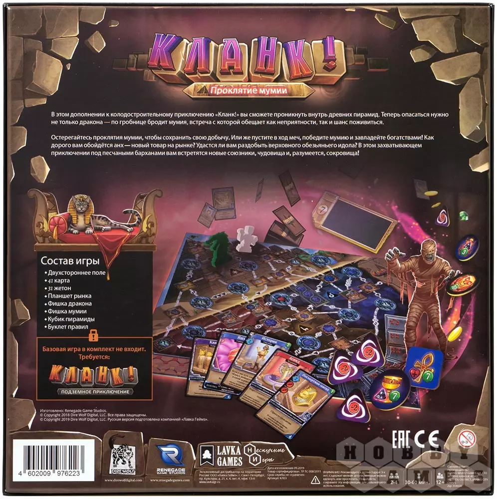 В дополнении "Проклятие мумии" для настольной игры "Кланк!" храбрые искатели сокровищ узнают правду! Вам предстоит разыскать невероятные сокровища, но путь будет преграждать бессмертная мумия, которая не хочет делиться своим богатством. Каждый раз, когда мумия проклинает вас, вы становитесь ближе к встрече с древним драконом – Кроксобеком, который устроил себе логово на самом дне пирамиды. Дополнение добавляет 40 новых карт в вашу колоду подземелья.