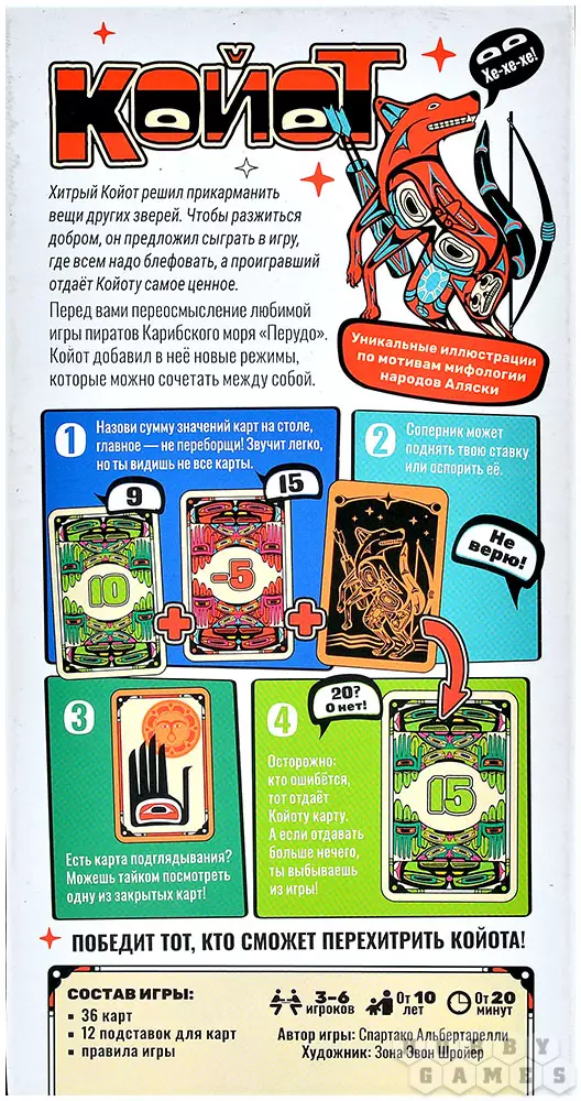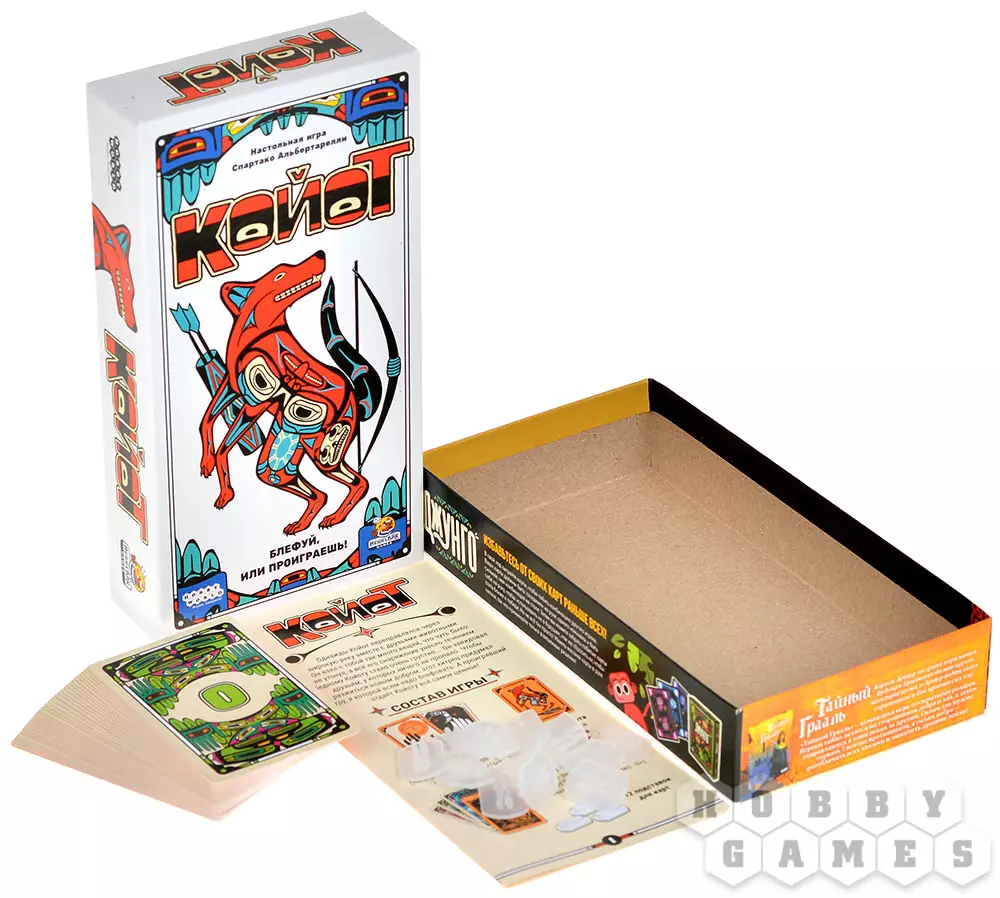 Каждый раунд – это тонкая психологическая дуэль: можно повышать ставки, можно оспаривать, можно даже одним глазком подглядывать. Но будьте готовы: за каждую ошибку придётся платить собственными картами, которые с радостью приберёт себе Койот. А если карты закончатся совсем, то вы и вовсе проиграете...
