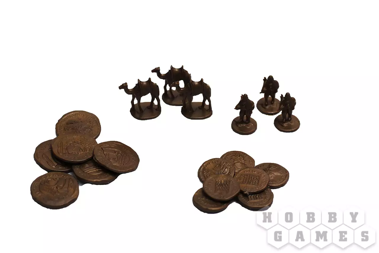 - Третий сценарий предлагает игрокам освоить правила караванной торговли. Прикольные фигурки вьючных верблюдов выставляются на поле при каждом основании поселения или превращении поселения в город. В этот момент игроки торгуются за выбор пути, на который будет поставлен верблюд. Расположение верблюдов важно, так как верблюд на дороге считается за два участка дороги при определении самого длинного торгового пути. Кроме того, город или поселение, "зажатое" между двумя верблюдами, приносят игроку на одно победное очко больше.
