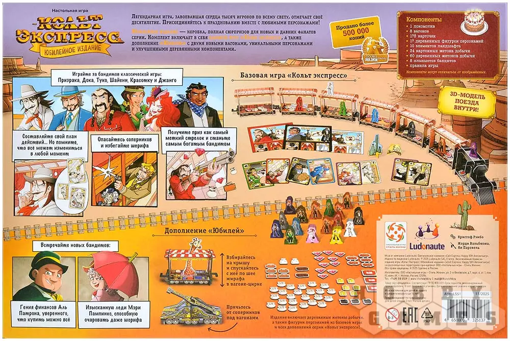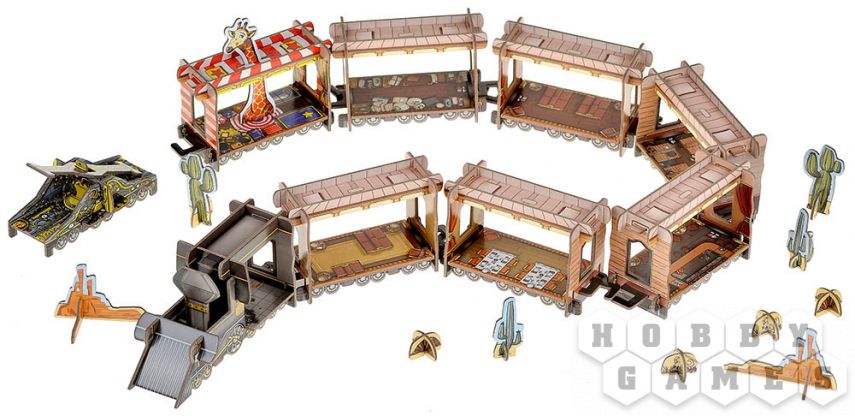 В эту коробку вошли базовая игра и полностью новое дополнение "Юбилей", которое приносит с собой два дополнительных вагона, уникальных персонажей, новые механики и усовершенствованные компоненты. Особое внимание заслуживают улучшенные деревянные жетоны, вагон-цирк, дрезина и фигурки бандитов, знакомых по классической версии и другим дополнениям серии.