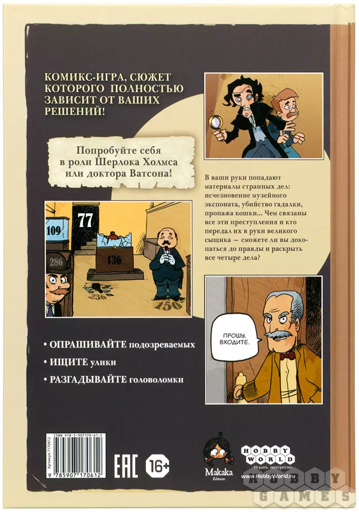 "Шерлок Холмс: четыре расследования" – это яркая комикс-игра с загадочными историями, где сюжет зависит от ваших решений и действий! Невозможно предугадать, как сложится конец игры. С точностью можно сказать, что любопытство возьмёт верх над читателями этого комикса, ведь одно действие целиком и полностью влияет на другое. Наверняка вы слышали об эффекте бабочки. Данная комикс-игра – яркая иллюстрация этому явлению, когда ваша дальнейшая судьба может измениться от конкретного действия, которое принесёт победу или поражение! В этом графическом произведении вы примерите на себя роль гениального Шерлока Холмса или его верного помощника – доктора Ватсона.