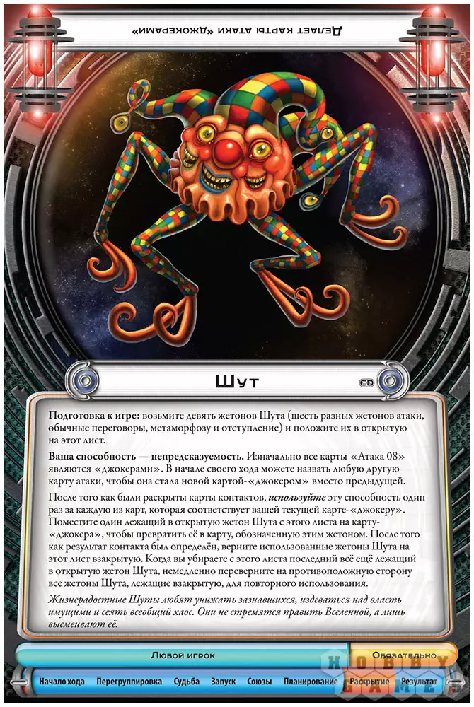 Затем из карт замешиваются колода судьбы и космическая колода. Посреди стола располагается Варп со шкалой для счётчиков далёких колоний. Теперь всё готово для начала первого хода: эта честь может быть отдана, например, самому молодому из участвующих игроков. Совершающий ход игрок именуется Агрессором.