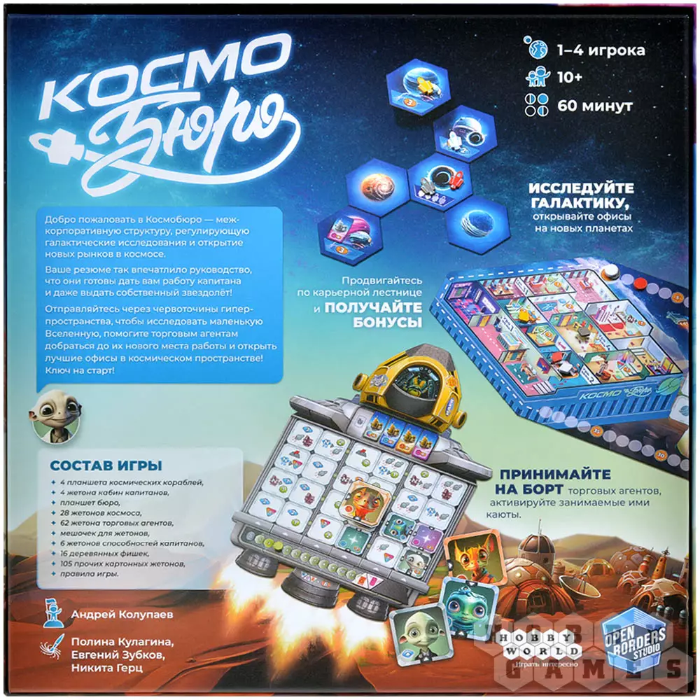 "Космобюро" – это увлекательная настольная игра, действие которой разворачивается в космическом пространстве. Вам предстоит взять на себя роль капитана звездолёта и отправиться в захватывающее приключение по гиперпространственным червоточинам. Вашей главной целью станет сбор максимального количества кредитов, и, возможно, получение грандиозного вознаграждения от Космобюро!