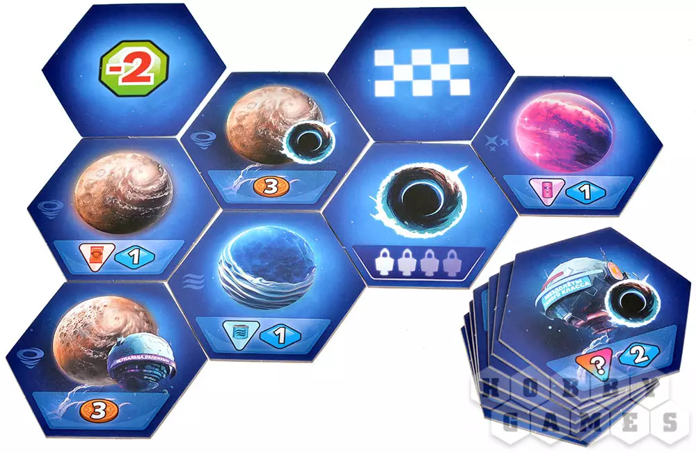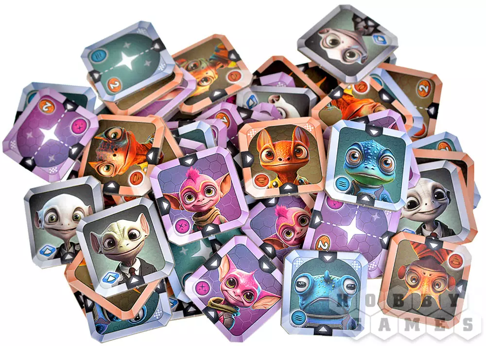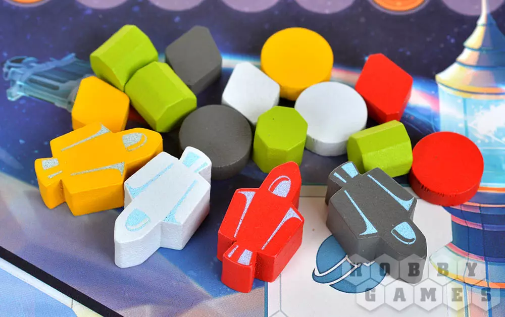 Соберите небольшую Вселенную из четырёх стартовых жетонов космоса. Рядом с ней поместите планшет бюро, двухсторонние жетоны кредитов и запас жетонов образцов. Возьмите жетоны агентов, поместите их в мешочек и вытяните оттуда случайные 3 штуки – они размещаются справа от трека бюро и образуют очередь агентов. Каждый игрок получает планшет своего космического корабля фишки топлива и корабля, 5 жетонов офиса и 3 стартовых торговых агента. Дальнейшие нюансы подготовки мы опустим и перейдём к сути.