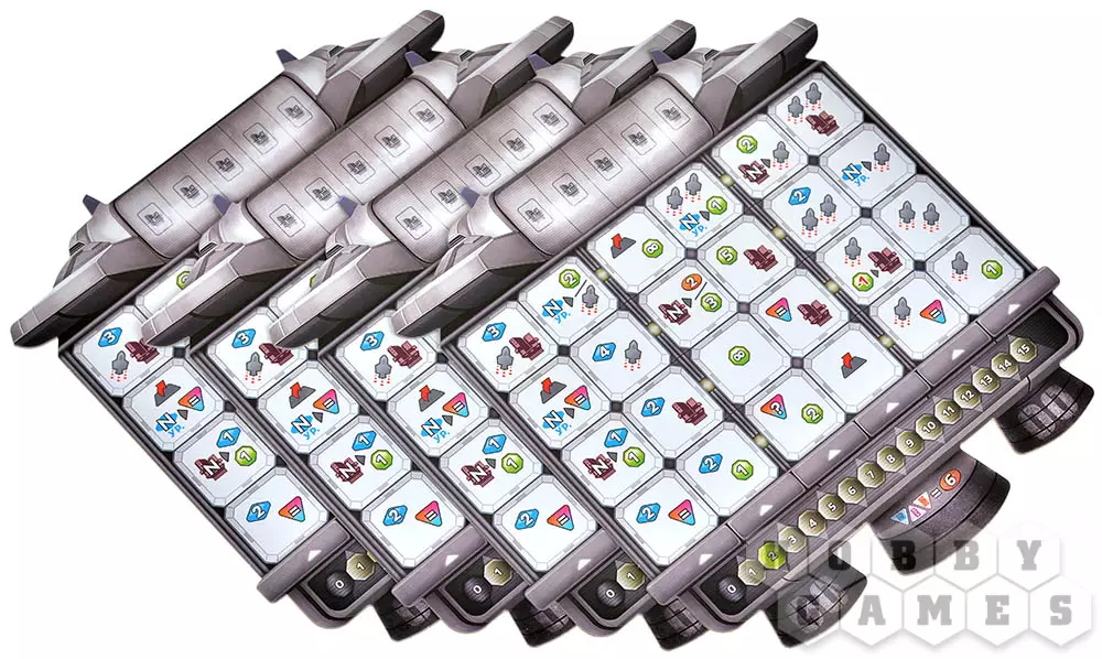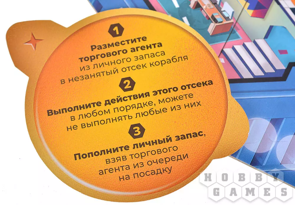 В первой фазе вы размещаете агента из своего запаса в пустой отсек на планшете корабля. Жетоны агентов имеют по краям от 2 до 3 контактов, а также есть особый жетон инспектора: на одной стороне у него 1 контакт, а на другой 4. При размещении можно как угодно поворачивать жетон, и при этом совсем необязательно продлевать все контакты, достаточно одного. В каждом отсеке изображены действия, накрывая которые вы можете выполнить в свой ход. Это может быть получение топлива, получения образца, увеличение объёма склада (чтобы хранить больше образцов), размещения офиса на планете, передвижение фишки по треку бюро или отправление в полёт. Последнее действие позволяет вам летать с одной планеты на другую, а для этого нужно топливо. Чтобы заправить бак, нужно выполнить соответствующее действие и оплатить его, а для этого нужны образцы. А чтобы получить образцы, вы должны выполнить соответствующее действие.