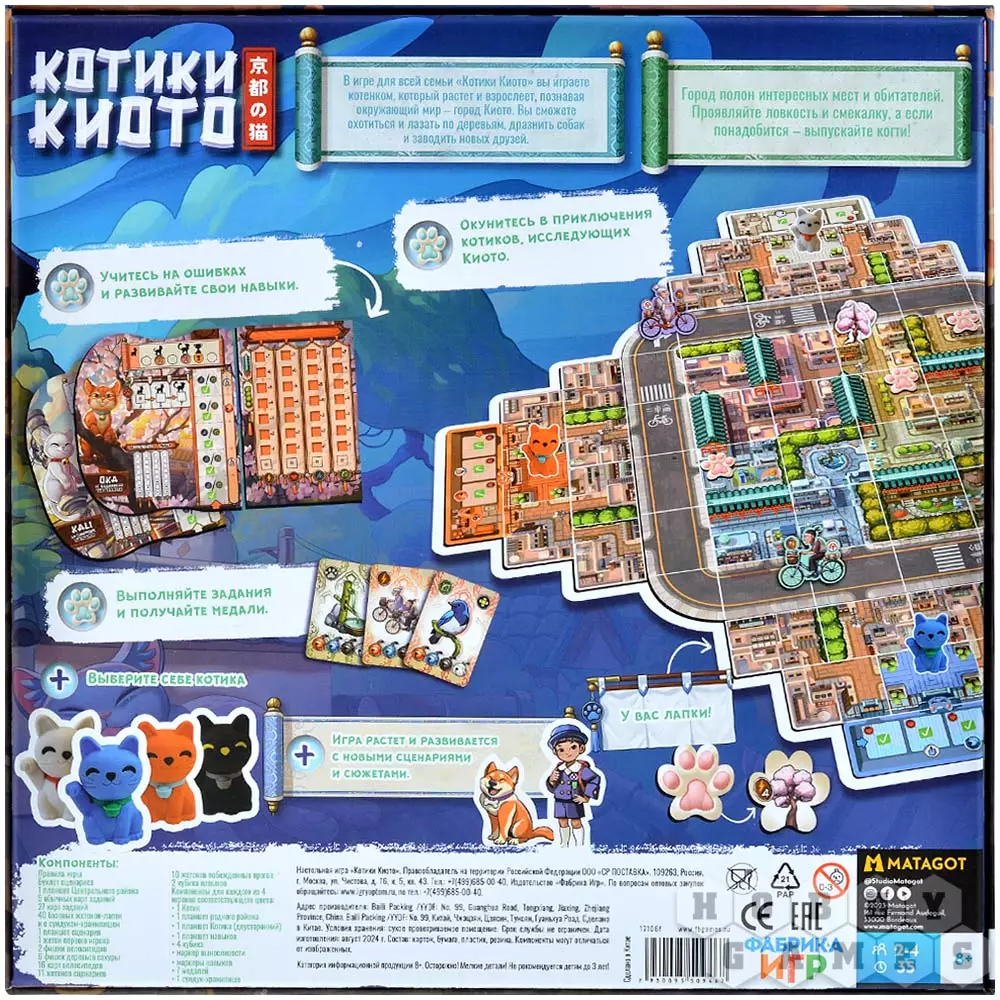 Добро пожаловать в Киото – город, полный загадок, вкусной еды и... пушистых исследователей! В этой настольной игре вам предстоит взять на себя роль одного из ловких и любопытных котят, которые отправляются покорять улицы и крыши большого города.