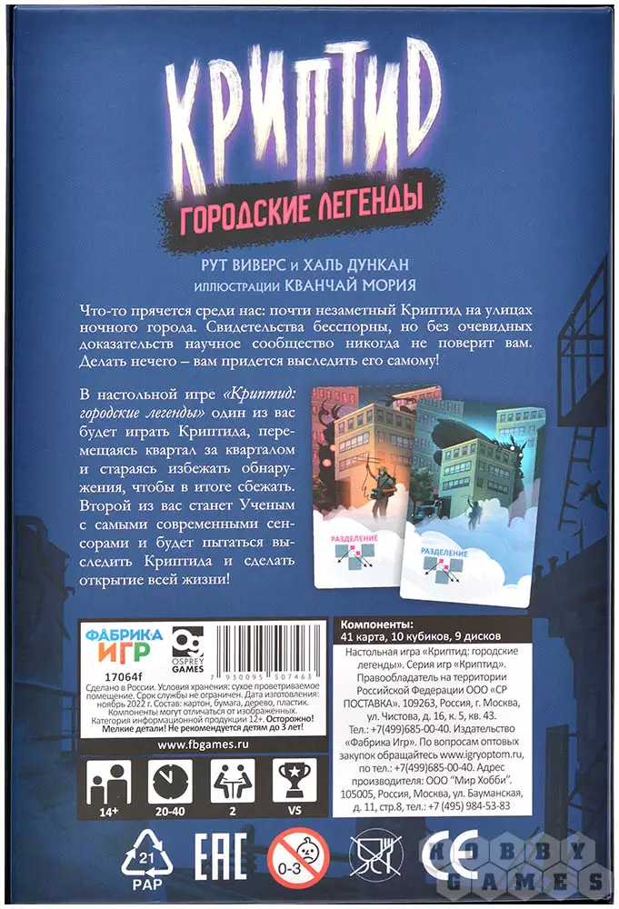 "Криптид. Городские легенды" – это динамичная карточная настольная игра. В отличие от оригинального "Криптида", что предназначен для более крупной компании, в "Городских легендах" сойдутся всего два игрока. Один из их возьмёт роль Учёного, а другой станет Криптидом! Игровое поле представляет собой ряд кварталов, которые Учёный будет сканировать в поисках Криптида – а сам Криптид будет стараться ускользнуть, хитроумно перемещаясь и заметая следы. Таким образом, Криптид победит, если сможет запутать оппонента и незаметно ускользнуть из города, а Учёный – если загонит Криптида в угол.
