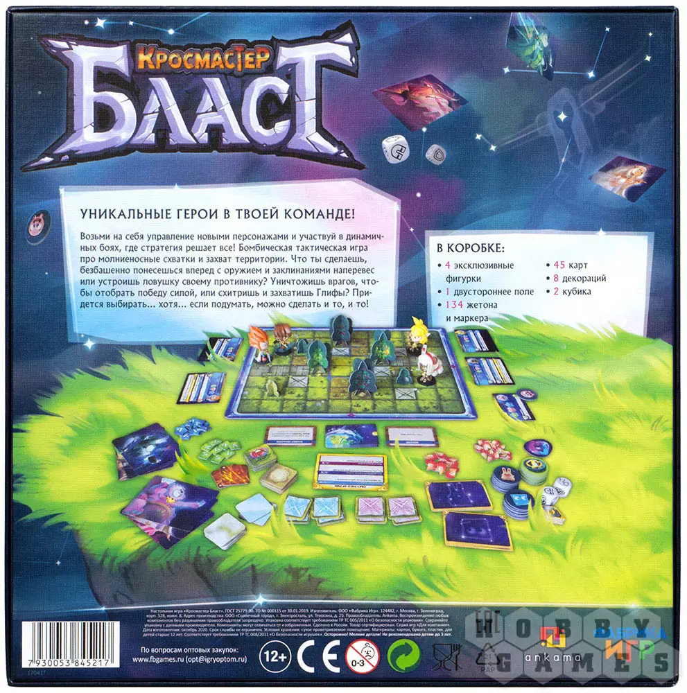 "Кросмастер Бласт" – это стратегическая настольная игра, в которой необходим тактический подход. Обращайте внимание на последовательность приёмов, используя особенности поля. Внутри находятся фигурки персонажей, которые совместимы с игрой "Кросмастер Арена 2.0". Вы сможете играть яркими персонажами, конструирующими ловушки, чтобы выиграть время и не нанести противнику урон, или же взаимодействующими со своей чистой энергией для настоящего боя. Сразитесь в динамичной схватке и возьмите под контроль символы, расположенные на арене сражения. Наслаждайтесь красочной вселенной в этой быстрой игре-перестрелке. Вас порадуют новые персонажи – уникальные бойцы, готовые выполнять улучшенные комбинации действий, и 3D-декорации, создающие атмосферу полного погружения во вселенную Кросмоза. Благодаря простым правилам игра подарит вам незабываемые эпические настольные сражения!