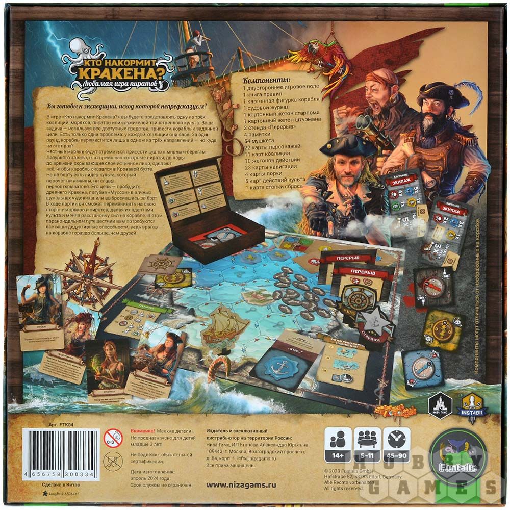 "Кто накормит Кракена?" проверит вашу социальную дедукцию и прекрасно развлечёт большую компанию. Ваша задача – повернуть корабль в нужном вам направлении. Честные моряки стремятся в Лазурный залив, коварные пираты – в Кровавую бухту. А третий игрок, тёмная лошадка, желает разбудить Кракена – и для этого ему нужно пожертвовать кем-то из экипажа или затопить судно, сделав его подношением чудовищу. Вас ждут заговоры, интриги, предательства и жаркие споры – скучно не будет! Сражайтесь за выживание, но не забывайте – Кракен не дремлет!