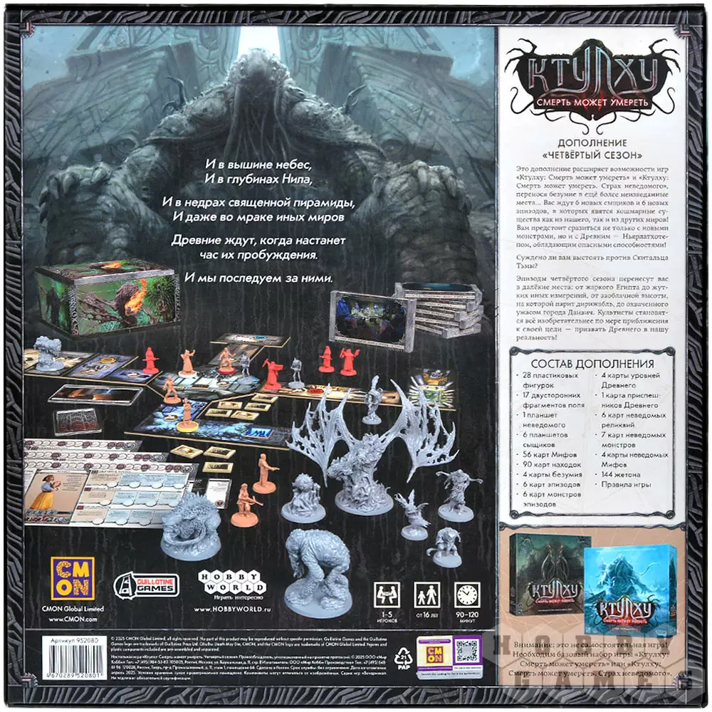 Дополнение "Четвёртый сезон" погружает вас в новые кошмары, расширяя границы базовых игр "Ктулху: Смерть может умереть" и "Страх неведомого". Шесть новых сыщиков с уникальными способностями отправятся в шесть жутких эпизодов, где их ждут не только уже привычные ужасы, но и кошмары далёких земель – от раскалённых песков Египта до искажённых реальностей иных измерений. Вам предстоит столкнуться с новыми монстрами, коварными культистами и самим Ньярлатхотепом, чей облик и способности способны сломить даже самых стойких. Каждый эпизод – это новое испытание: погоня на летящем дирижабле, проникновение в проклятые руины, схватка в охваченном паникой городе. Новые механики и смертоносные сюрпризы сделают каждую партию непредсказуемой. "Четвёртый сезон" не просто добавляет контент – он раздвигает границы безумия, предлагая свежие тактические вызовы и ещё больше путей к победе... или гибели. Готовы ли вы принять новый виток хаоса?