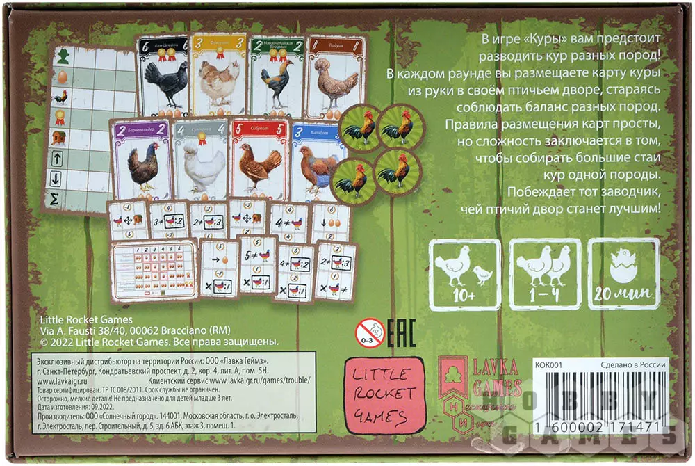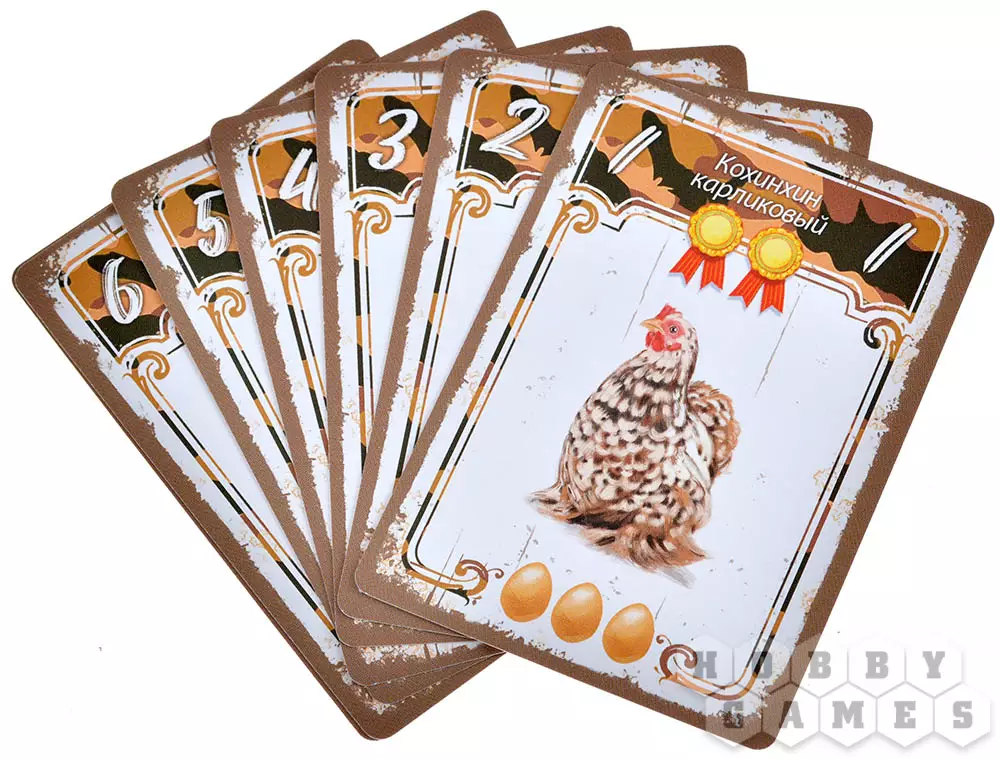 Перед вами открывается великолепный мир птиц. В каждом раунде вам нужно стратегически размещать карты кур, заботясь о гармоничном балансе различных пород. Довольно лёгкие и понятные правила игры, но бескрайние возможности для тактических решений делают эту настолку захватывающей и непредсказуемой.