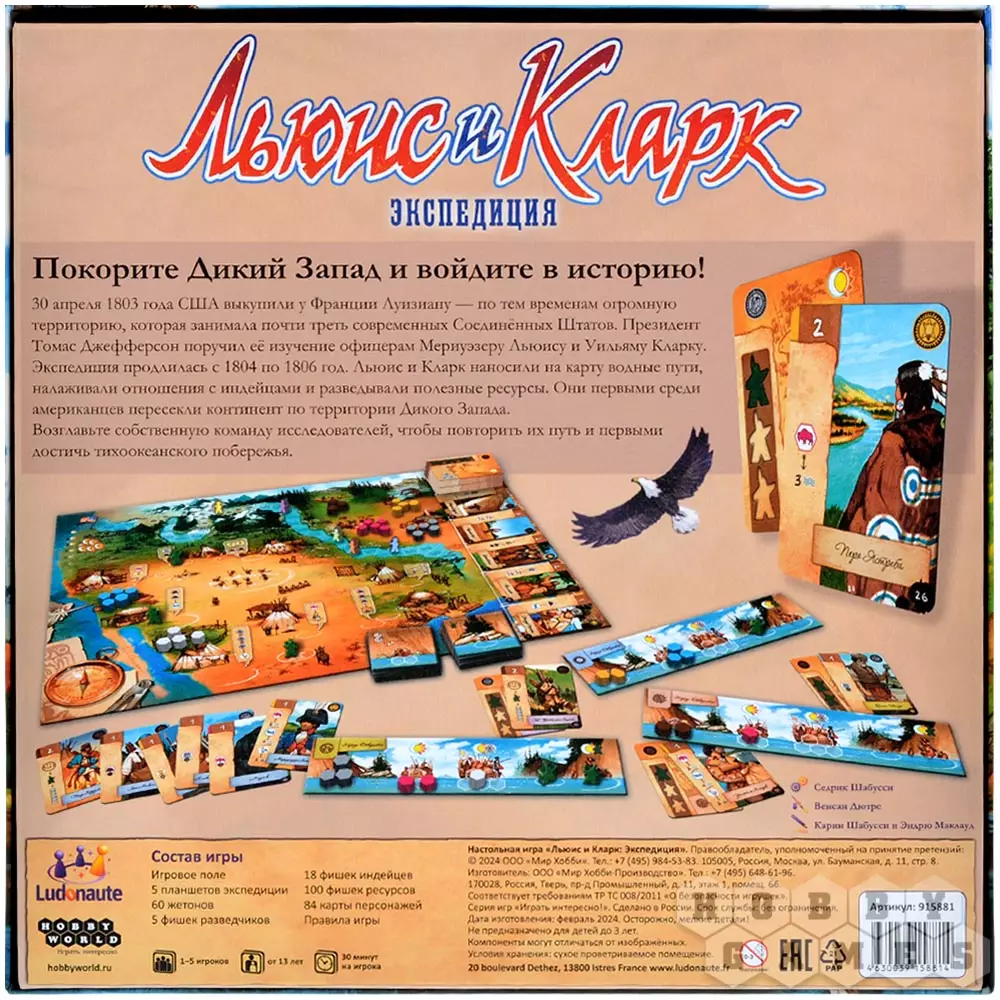 В настольной игре "Льюис и Кларк: Экспедиция" вы станете главой собственной команды исследователей и сможете повторить успех двух именитых офицеров. Прокладывайте свой путь по стопам Льюиса и Кларка, находите месторождения ценных ресурсов, открывайте водные маршруты и заручайтесь поддержкой индейцев, чтобы первыми добраться до тихоокеанского побережья!