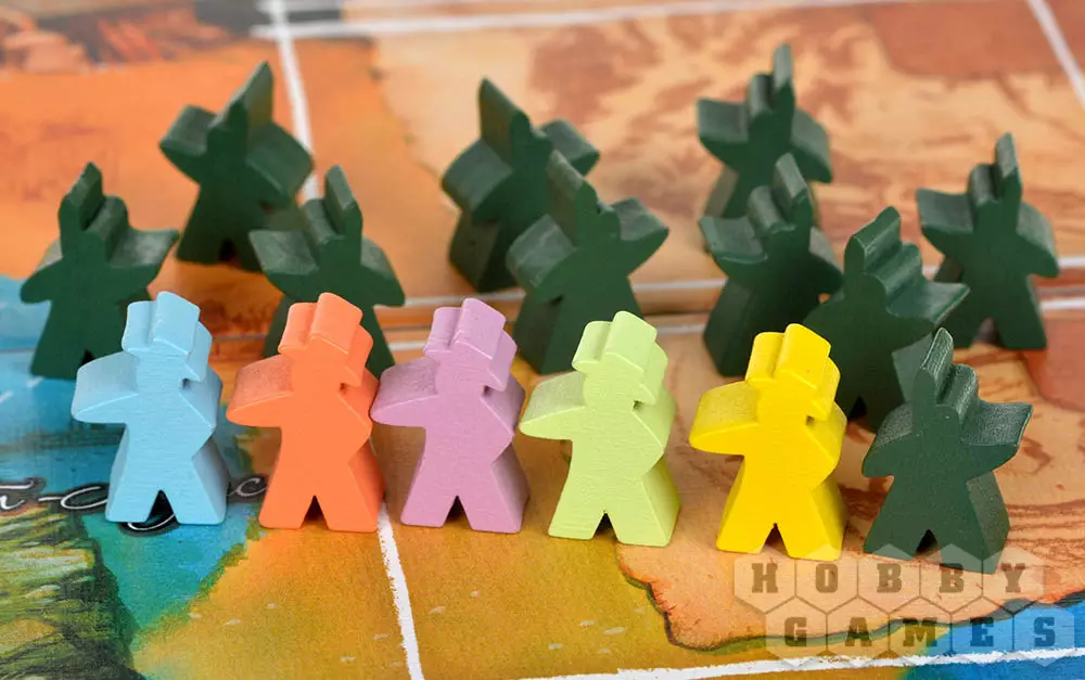 И в первом, и во втором случае потребуется потратить фишки индейцев из личного запаса для оплаты действия. Используя карты персонажей вы сможете добывать базовые ресурсы, такие как древесина, еда, снаряжение и мех, получать новые фишки индейцев, а также осуществлять движение по маршруту. В поселении же вас ждут более интересные действия: