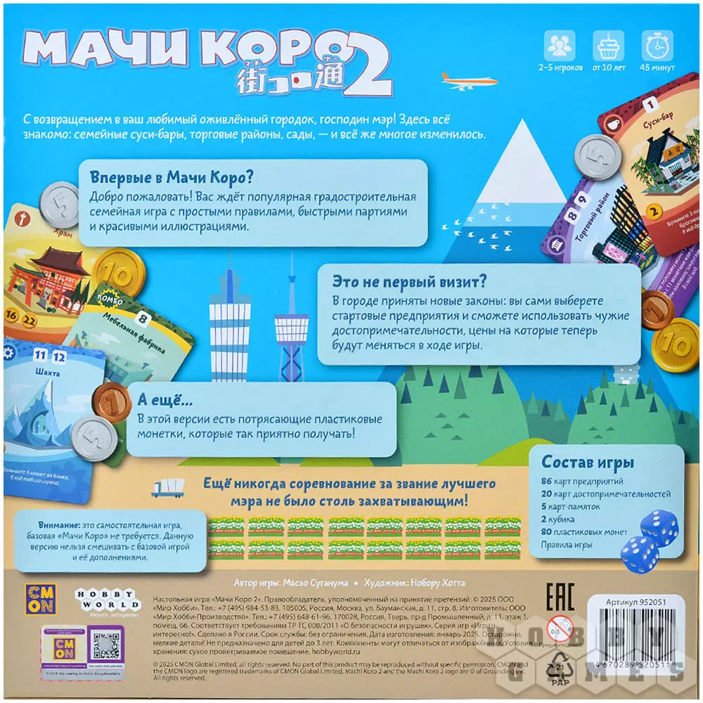 "Мачи Коро 2" – это градостроительная настольная игра для всей семьи, в которой вам предстоит взять на себя роль не абы кого, а самого мэра! Каждый из вас старается привлечь в свой город как можно больше туристов, а ничто не привлекает их лучше, чем достопримечательности: именно в их строительстве вы и будете соревноваться. Однако строительство чего-то примечательного стоит дорого, поэтому надо сначала пополнить казну: стройте в своём городе промышленные предприятия, магазины, рынки, кафе и рестораны, которые будут приносить вам доход в виде приятных пластиковых монеток! Подойдите к делу с умом, и успех не заставит себя долго ждать!