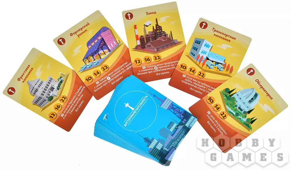 В начале игры у вас есть 5 монет и пустое поле, на которым вы и будете возводить свой город. А между вами, в центре стола, расположен резерв карт предприятий и достопримечательностей, выложенный в сетку 5x3. Тут начинается фаза стартового строительства, длящаяся 3 раунда: каждый из вас по очереди, без броска кубика, может купить себе одно предприятие и разместить в своём городе. На это тратится ваш стартовый капитал. Как только эта фаза завершится, вы приступите к основной игре.