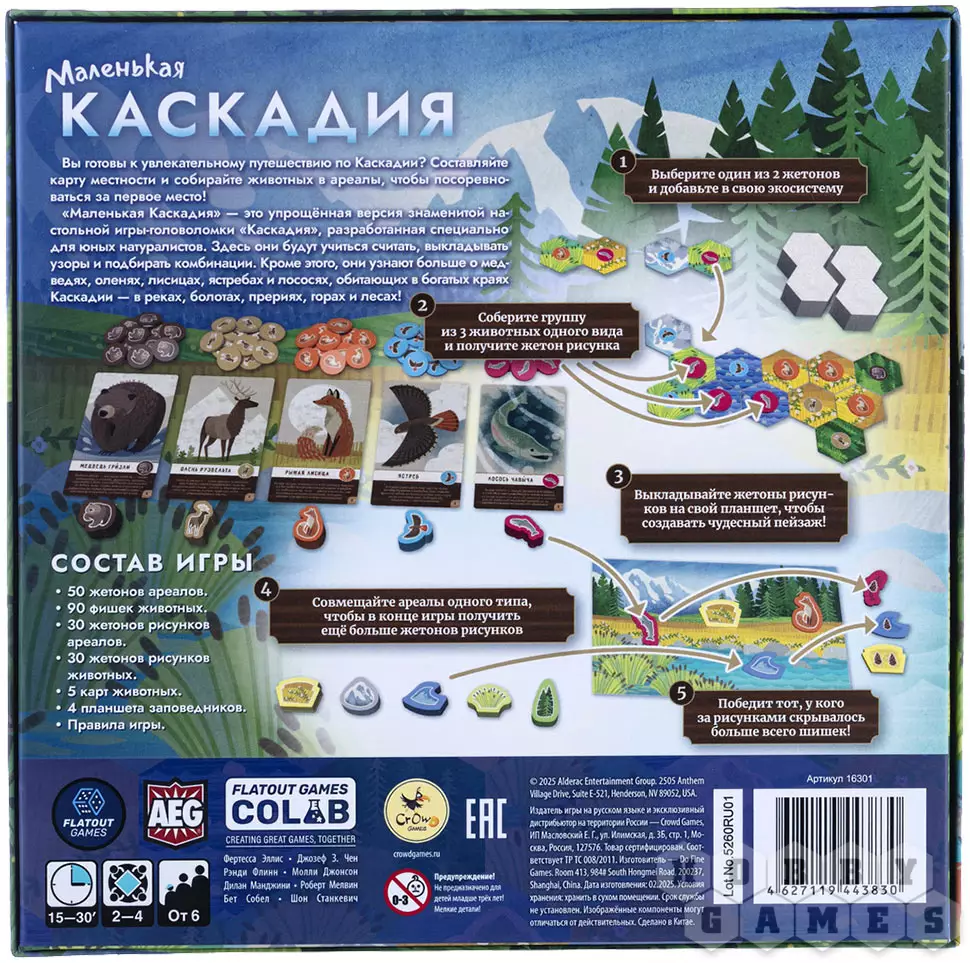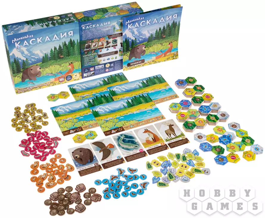"Маленькая Каскадия" – это яркая и динамичная стратегическая игра, специально разработанная для детей. Вам предстоит собирать красочные жетоны с изображением пяти типов ландшафтов: густых лесов, топких болот, бескрайних прерий, величественных гор и извилистых рек. Размещая их на своём планшете, вы создаёте уникальную экосистему, которую затем заселяете различными видами животных. За каждую удачную комбинацию из трёх одинаковых зверей или группу однотипных ландшафтов вы получаете особые жетоны с заветными шишками – вашей победной валютой.
