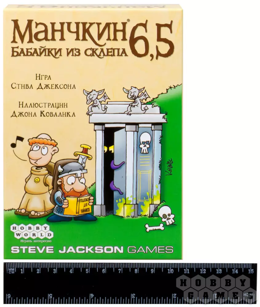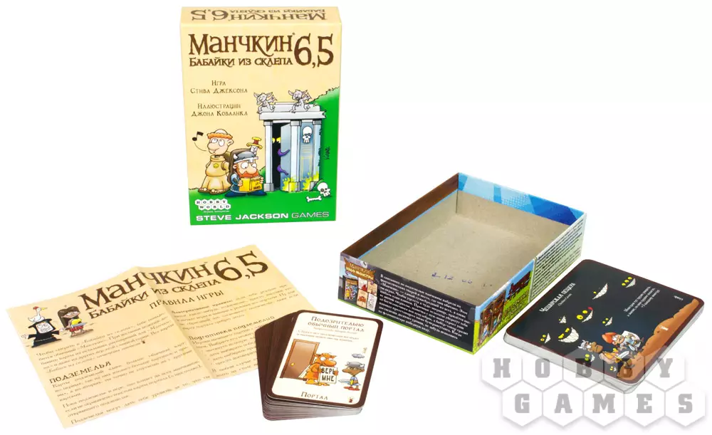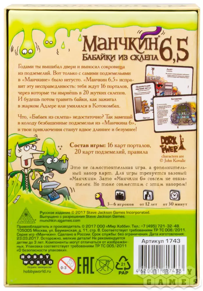 "Манчкин 6,5: Бабайки из склепа" – это небольшое дополнение, которое, однако, добавляет в игру новую механику и очень сильно расширяет игровой процесс! Оно похоже на "Манчкин 6. Безбашенные Подземелья" и является его логическим продолжением. Теперь в игре появляется новый формат карт – подземелья (в этой версии – склепы), которые лежат себе в сторонке и задают тон всему вашему приключению, ведь именно по этому данжену вы и будете передвигаться! Каждый данжен обладает специальными свойствами, которые работают на всех игроков! Например, данжен "Котокомбы" дают бонусы Котейкам, игроками с кошачьими фамилиями или с кошачьими ушками на голове, а также усиливают всех монстров, в чьих именах есть буквы "К", "О" и "Т"!