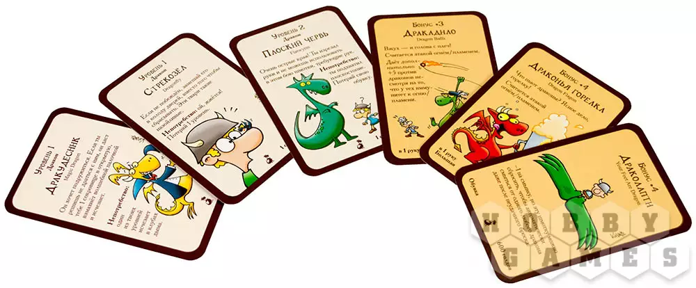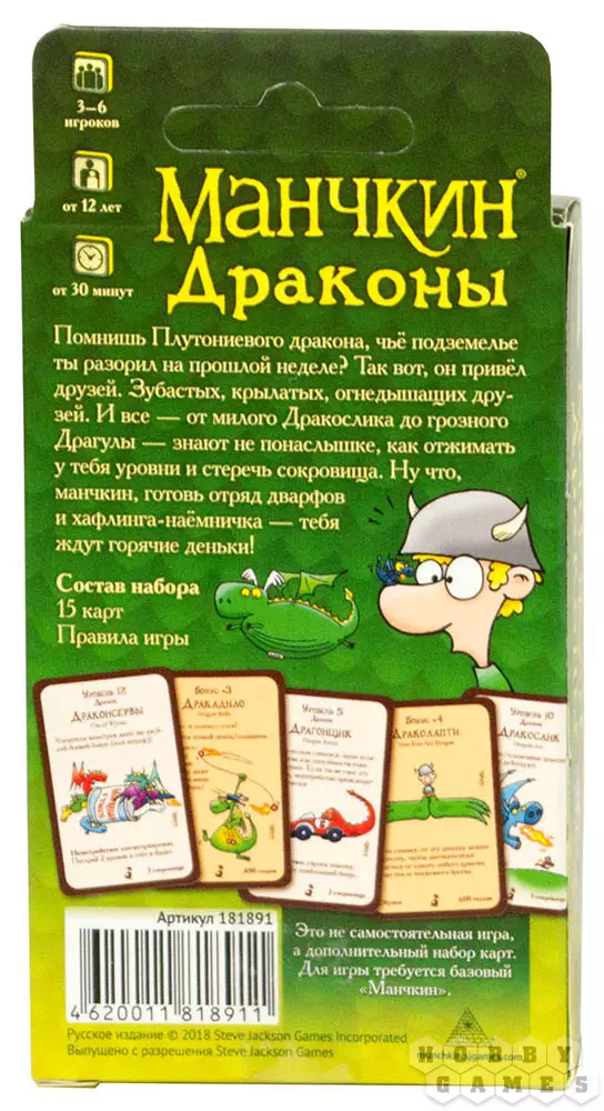 Набор включает в себя целых пятнадцать новых карт, среди которых 12 дверей и 3 сокровища, включая одного Наёмничка. Все новые карты просто замешиваются в вашу колоду, а при желании легко извлекаются из неё, так как все карты помечены специальным символом. Встречайте новых потрясающих монстров, милейшего "Дракослика" и опасные "Драконсервы"! Скорее опробуйте мощнейшую пушку "Дракодило", которое почти как кадило, только огненное!