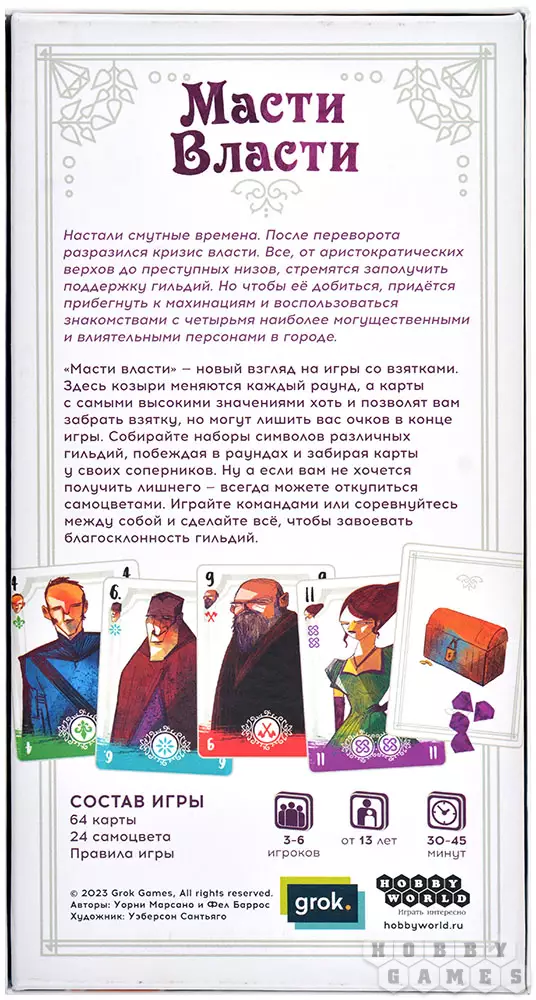 "Масти власти" – это карточная настольная игра, открывающая взгляд на игры со взятками под новым углом! Козыри меняются каждый раунд, а карты с самыми высокими рангами не всегда приносят пользу: да, они позволят вам забрать взятку, но ближе к концу игры могут лишить вас победных очков. Собирайте наборы символов различных гильдий, побеждая своих соперников и забирая у них карты. А если переживаете, что можете получить лишнего, то всегда можно откупиться самоцветами! Играйте, объединившись в команды, или соревнуйтесь каждый сам за себя. Приложите все усилия, чтобы завоевать благосклонность гильдий.