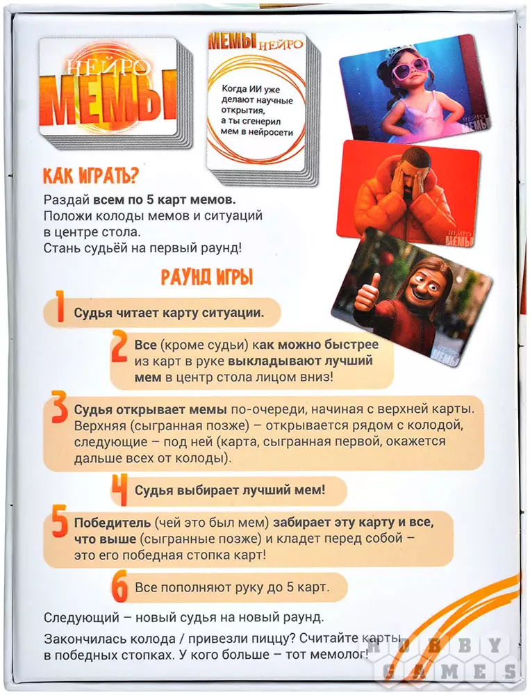 Правила игры "Мемы Нейро" настолько просты, что объяснены прямо на коробке! В начале раунда ведущий зачитывает одну ситуацию – она может быть смешной, злободневной, неловкой или какой-либо ещё. Следом каждый игрок должен выложить из руки по одной карте мема, который, согласно его мнению, подходит для озвученной ситуации. Когда игроки закончат, ведущий выбирает лучший мем, а его автор получает часть оставшихся карточек в качестве трофеев. Тот, у кого стопка трофеев в конце игры окажется наиболее внушительной, получает почётное звание главного мемолога вашей тусовки!